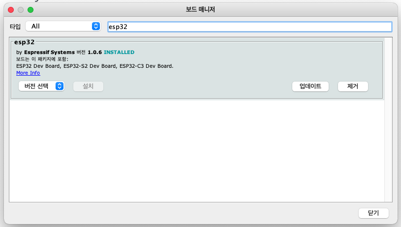 ▶ [툴] - [보드] - [보드매니저] 에서 ESP32 검색 후 ESP32 설치