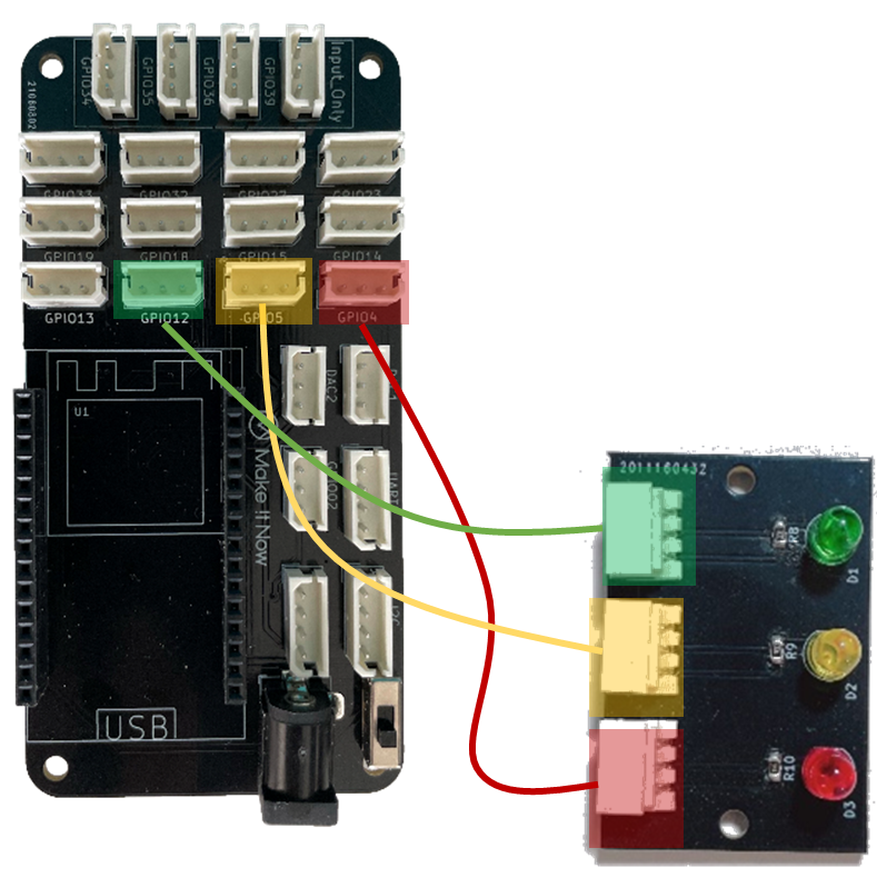 ▶ LED 3개를 모두 켜보는 실습을 하기 위해서 아래와 같이 선을 연결해주세요.