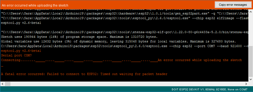 ▶ 우선, 아두이노에서 내가 작성한 코드가 ESP32 보드에 업로드가 되어야 하는데, 다른 보드에 코드가 업로드가 되고 있다면?? 이런 에러가 나타날 수 있습니다.