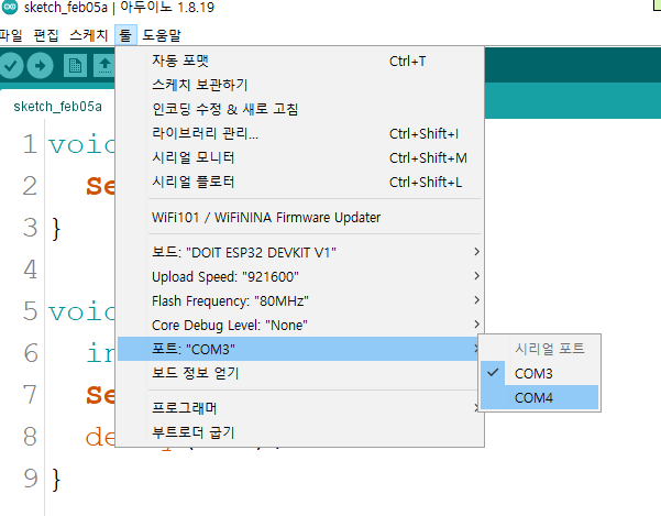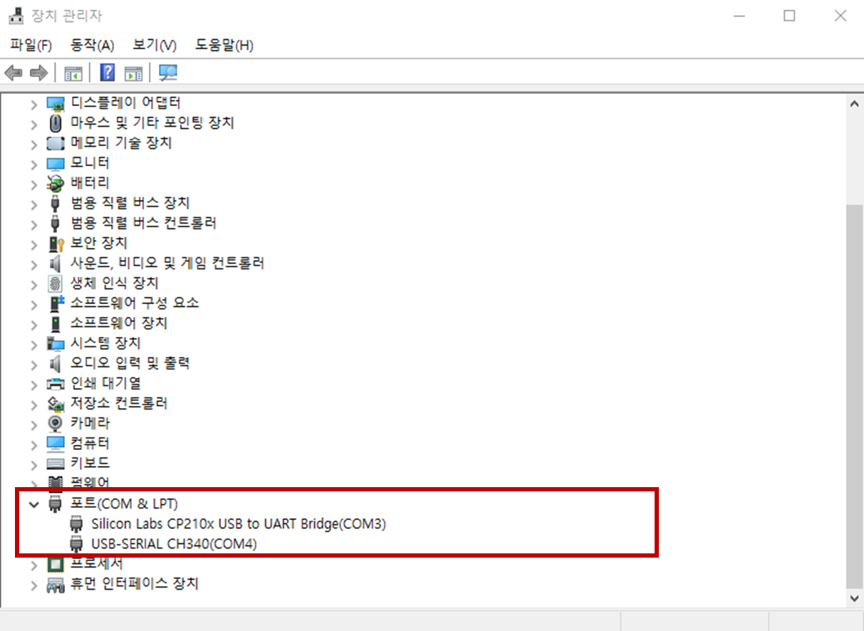 ▶ 위에 포트를 보시면 COM3 / COM4 두 개가 연결되어 있는 걸 확인 할 수 있습니다.