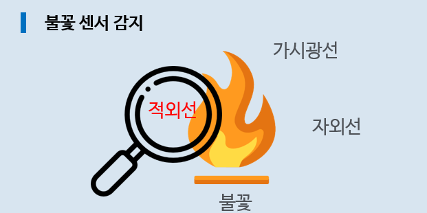 불꽃 센서는 화재시 연소 반응에 의해 열, 연기, 화염, 연소가스 등 연소생성물이 발생되고, 열복사로 빛이 방출 되는데 그 빛은 화염의 온도에 따라 다른 파장을 가지며 이런 파장의 차이로 적외선, 가시광선, 자외선 등 파장의 영역으로 구별됩니다.