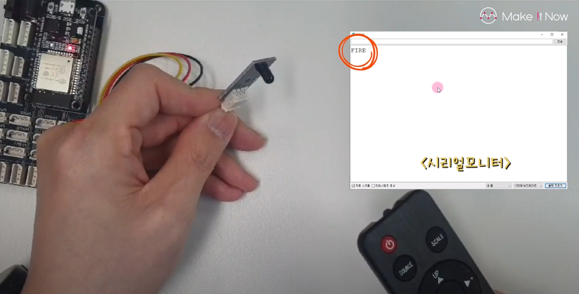 ▶ 하지만, 실내에서 불꽃을 테스트하는 것은 위험하죠?? 그래서 적외선을 보낼 수 있는 리모컨으로 한번 동작시켜 보도록 하겠습니다.