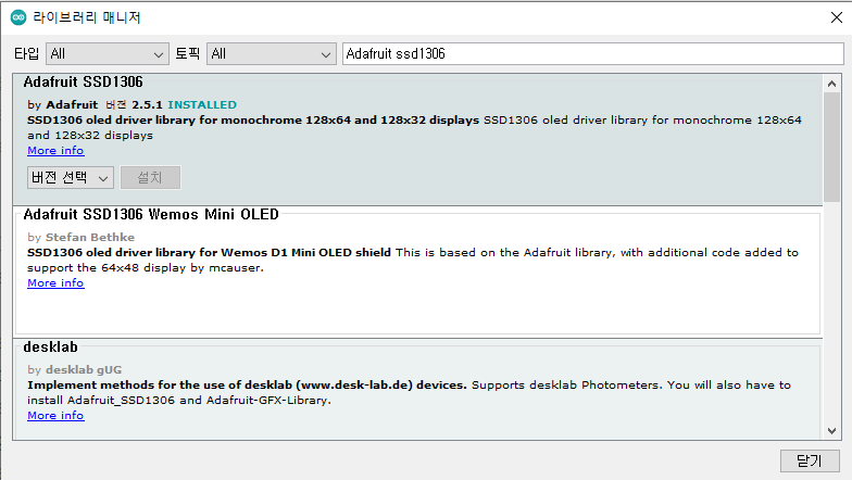 ▶ 라이브버리 매니저에서 "Adafruit SSD1306"이라고 검색해주시고. 최신버전으로 설치해주시면 됩니다.