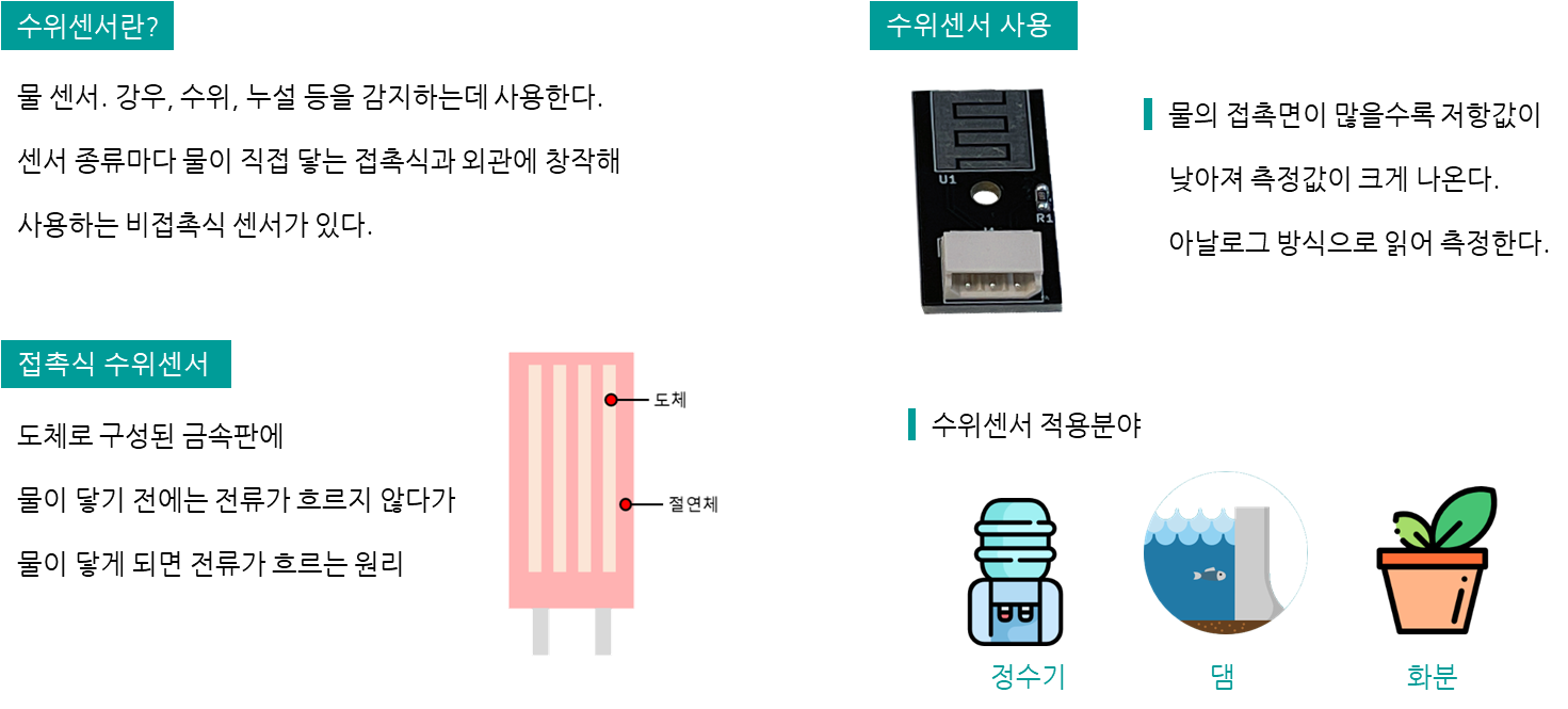 이번 시간에는 수위센서를 활용하여 비가 오는지 확인하는 시스템을 만들어 보도록 하겠습니다 :)
