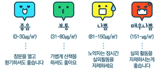 - 미세먼지 <= 50 : 초록색 / 50 < 미세먼지 <= 150 : 주황색 / 150 < 미세먼지 : 빨간색