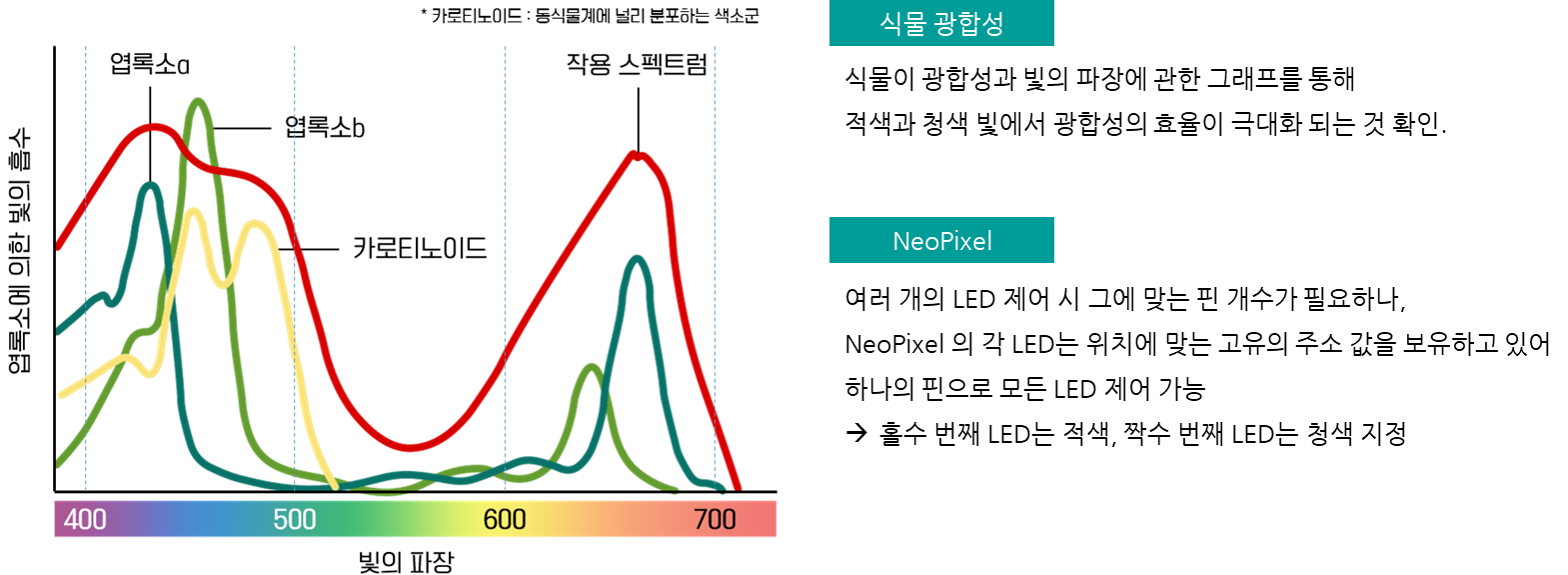 나타냅니다. 이를 기반으로 메이크잇나우 스마트키트의 NeoPixel을 활용하여, 가장 효율적인 식물생장 LED를 만들어