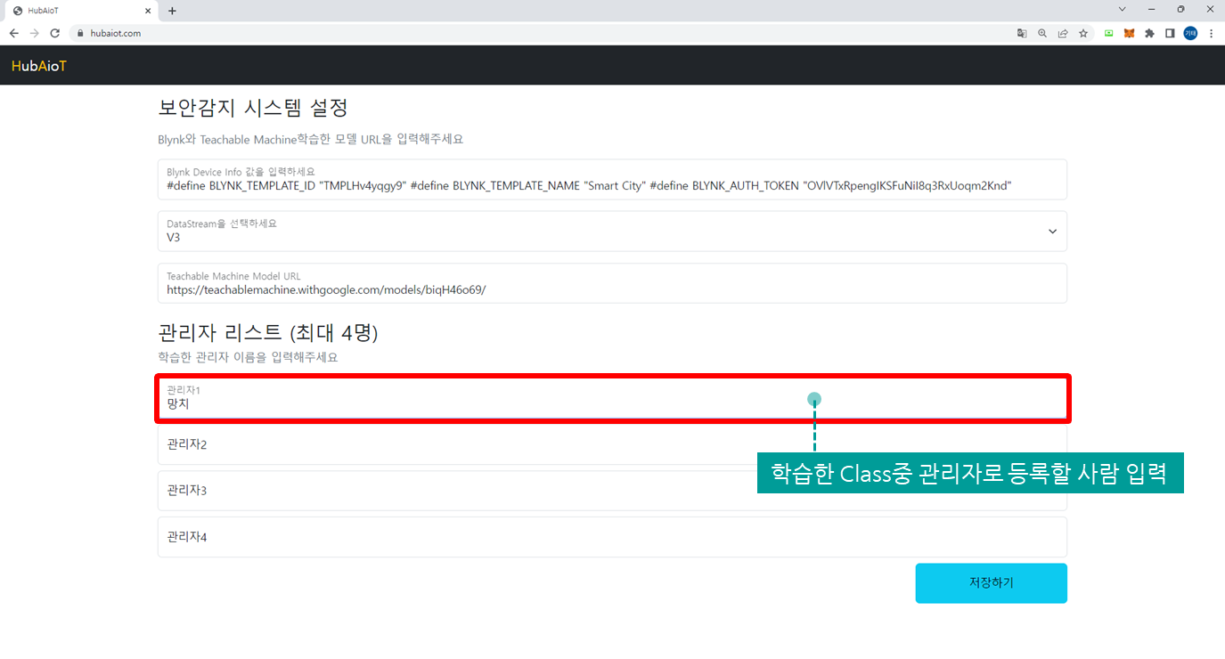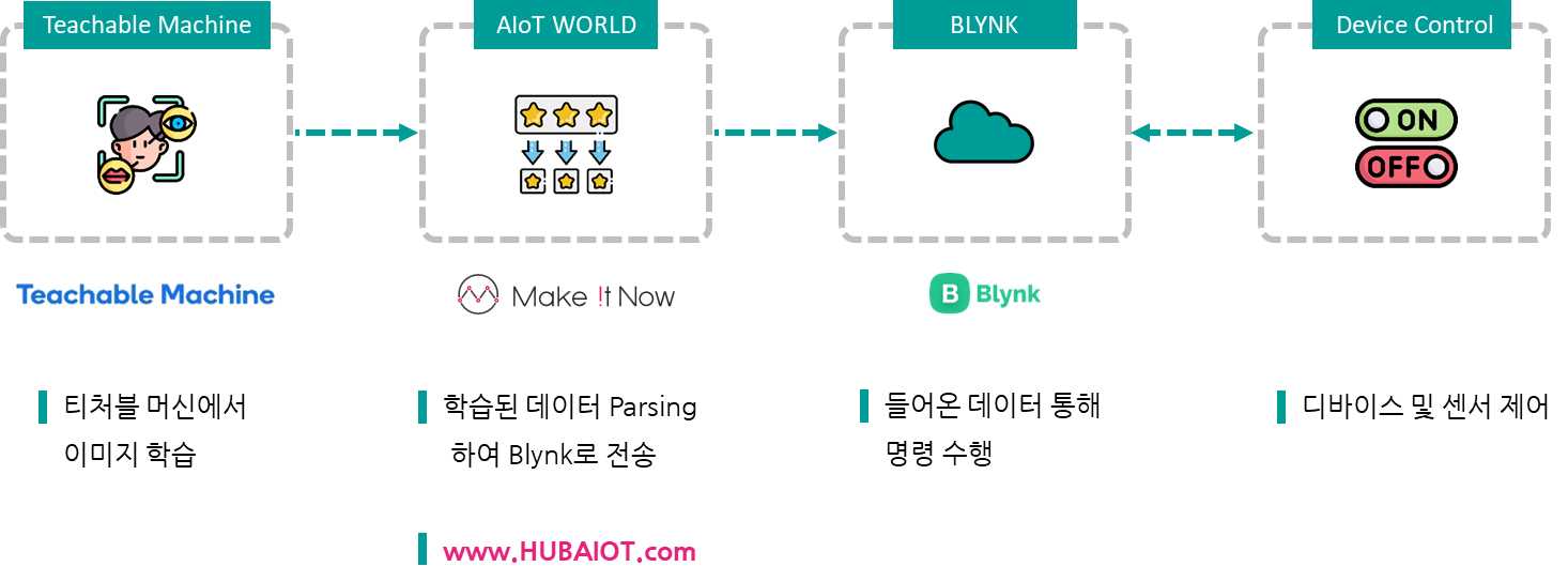 먼저 허브 AIOT를 사용하기 위해서는 티쳐블머신에서 학습한 모델의 값을 가져오기 위한 URL 과 Blynk의 디바이스와