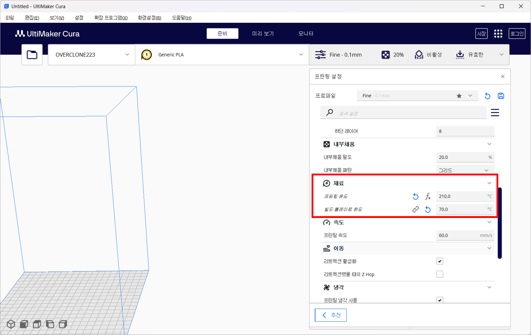 Overclone 223 의 경우, Cura 에서 기본적으로 지원되지 않는 모델로 커스터마이징 해줘야 합니다.