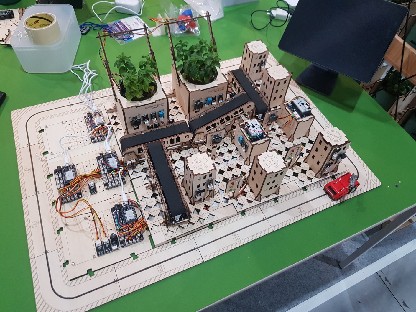 그리고 전시되어있는 테블릿의 버튼을 눌러 임의의 건물에 화재를 발생시킬 수 있어요.