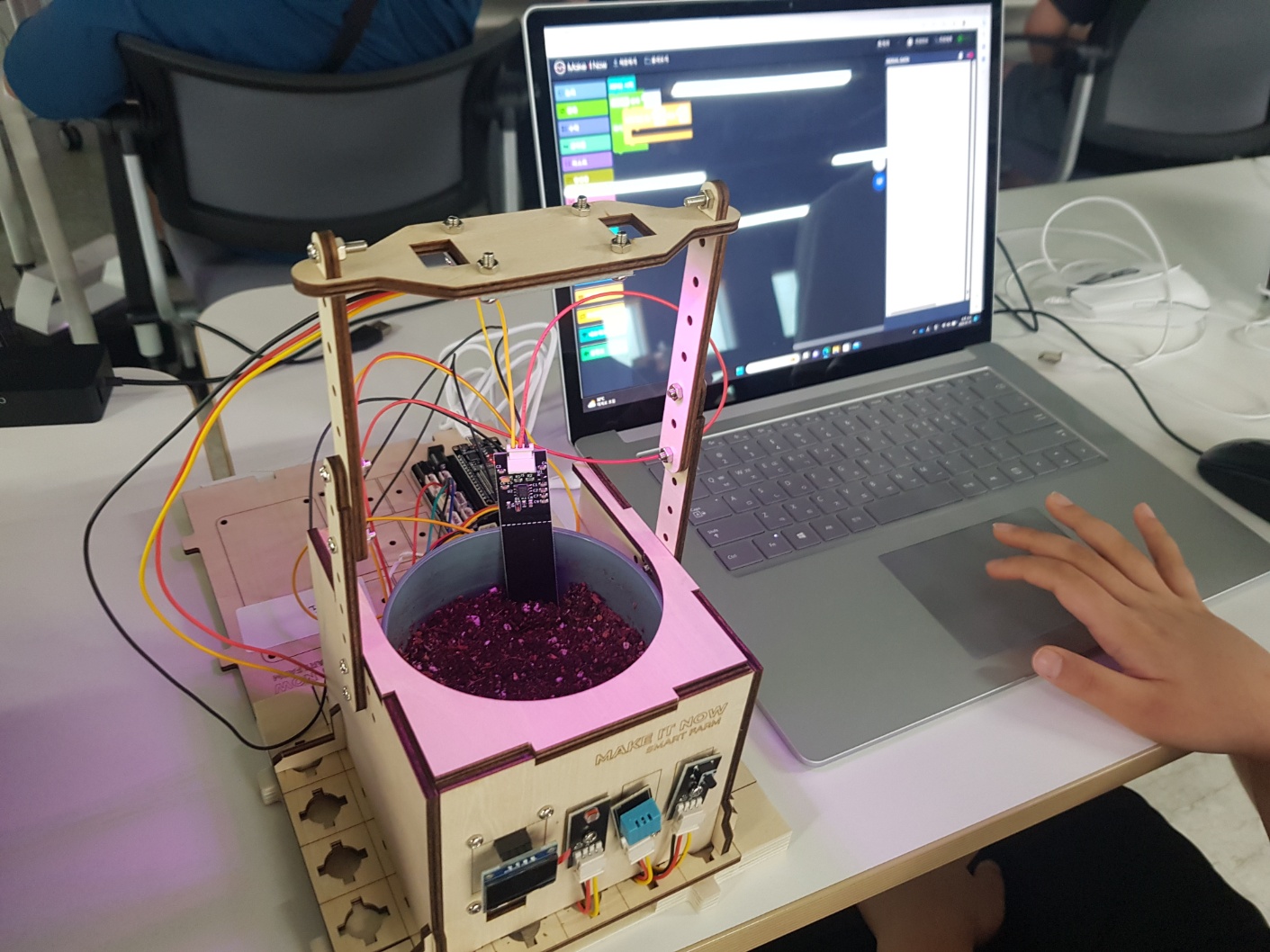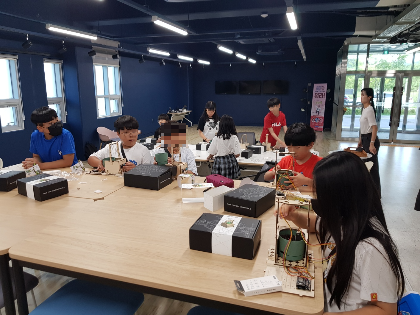 이론 학습이 끝나고 자신들만의 스마트팜 키트도 조립해보았습니다. 조립할 때는 눈동자가 초롱초롱~ 하네요 :) 몇몇 학생들은 교안에 있는 매뉴얼을 보고 혼자서 뚝딱뚝딱 ~~