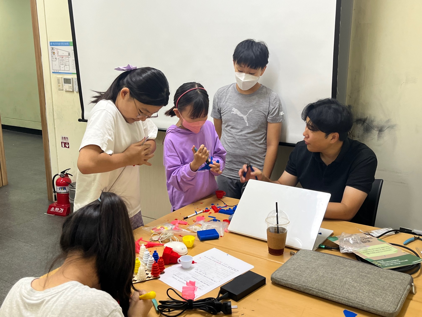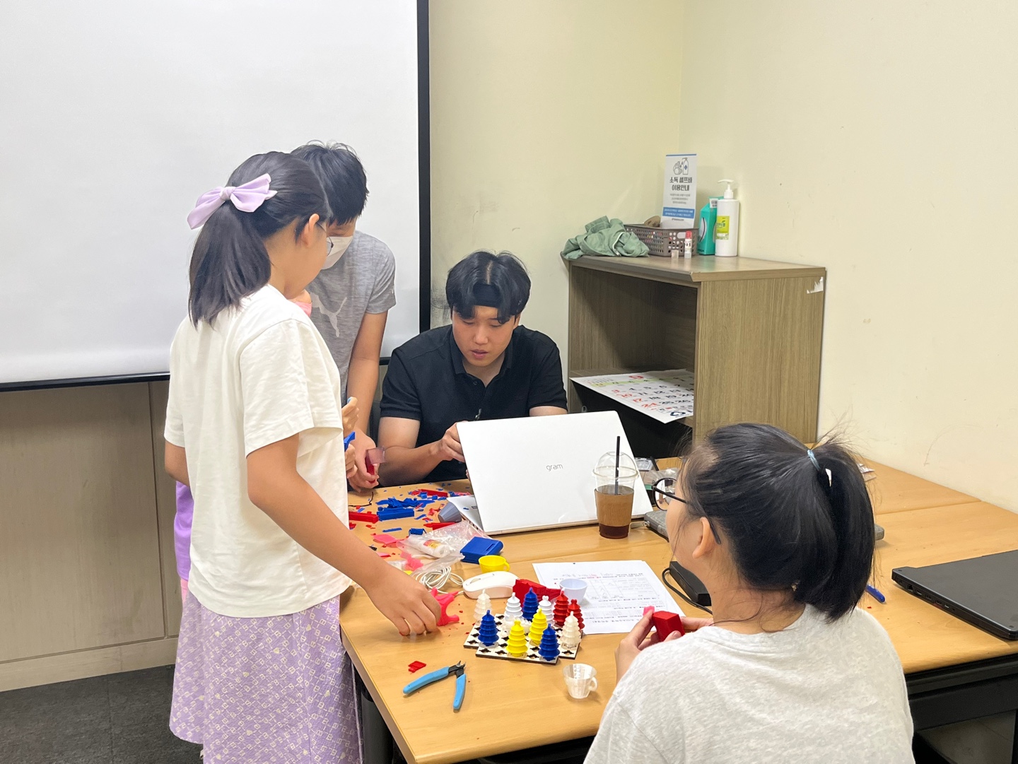 틴커캐드와 3D프린터에 대해서 학습을 하고나면 이제 도시에 구성되는 다양한 건축물과 같은 것들은 직접 설계해서 출력해보았습니다. 프린팅 후에는 서포터들도 함께 출력이 되기 때문에, 선생님과 함께 서포터를 조심스럽게 뜯어나가봅니다 ^^