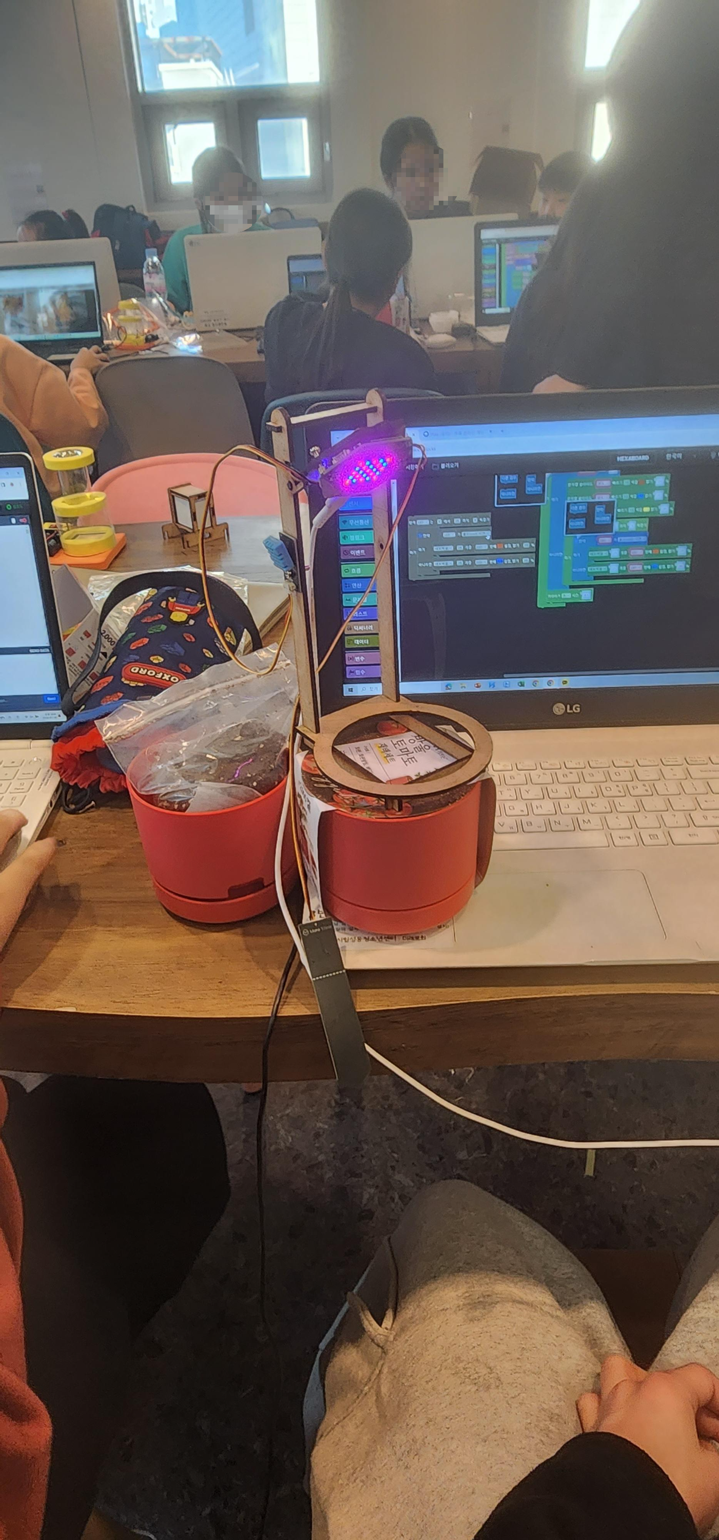 위쪽에 헥사보드를 설치하고 흙속에 토양수분을 측정하는 센서, 옆쪽에 온습도 센서를 설치해요.