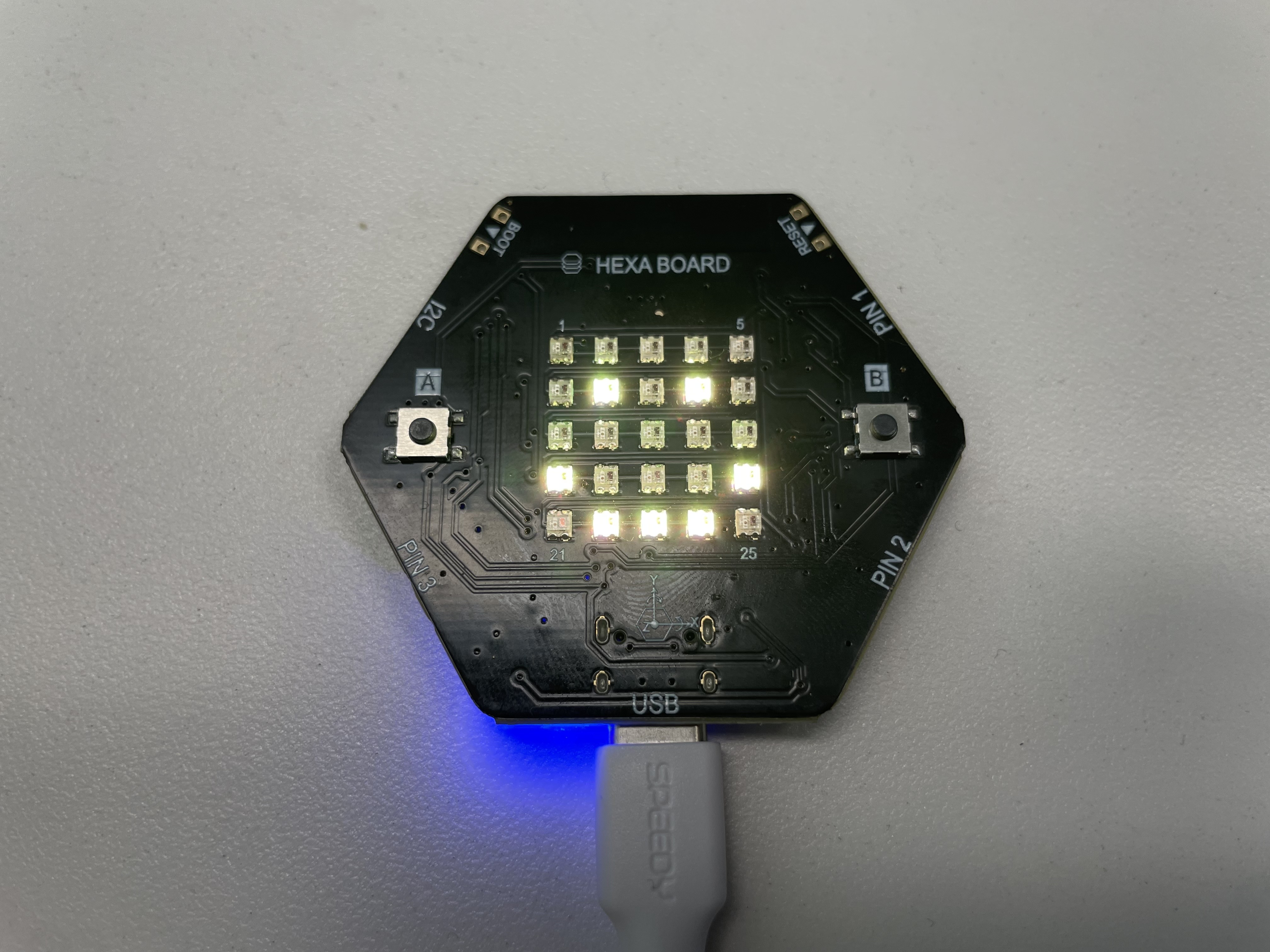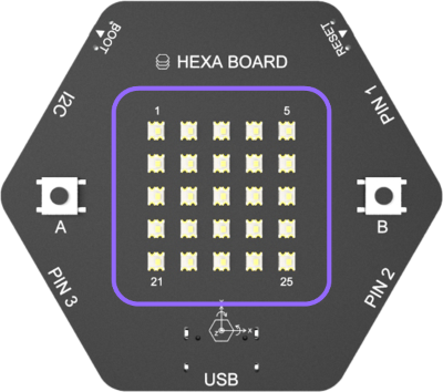 오늘 첫번째로 사용해 볼 센서는 헥사보드 중앙에 위치한 5X5 네오픽셀 LED 입니다.