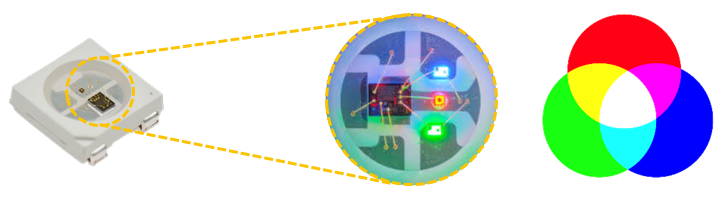 네오픽셀은 각각의 내부에 R,G,B LED가 들어있어 이 LED색의 조합에 따라 다양한 색을 연출할 수 있도록 되어있습니다.