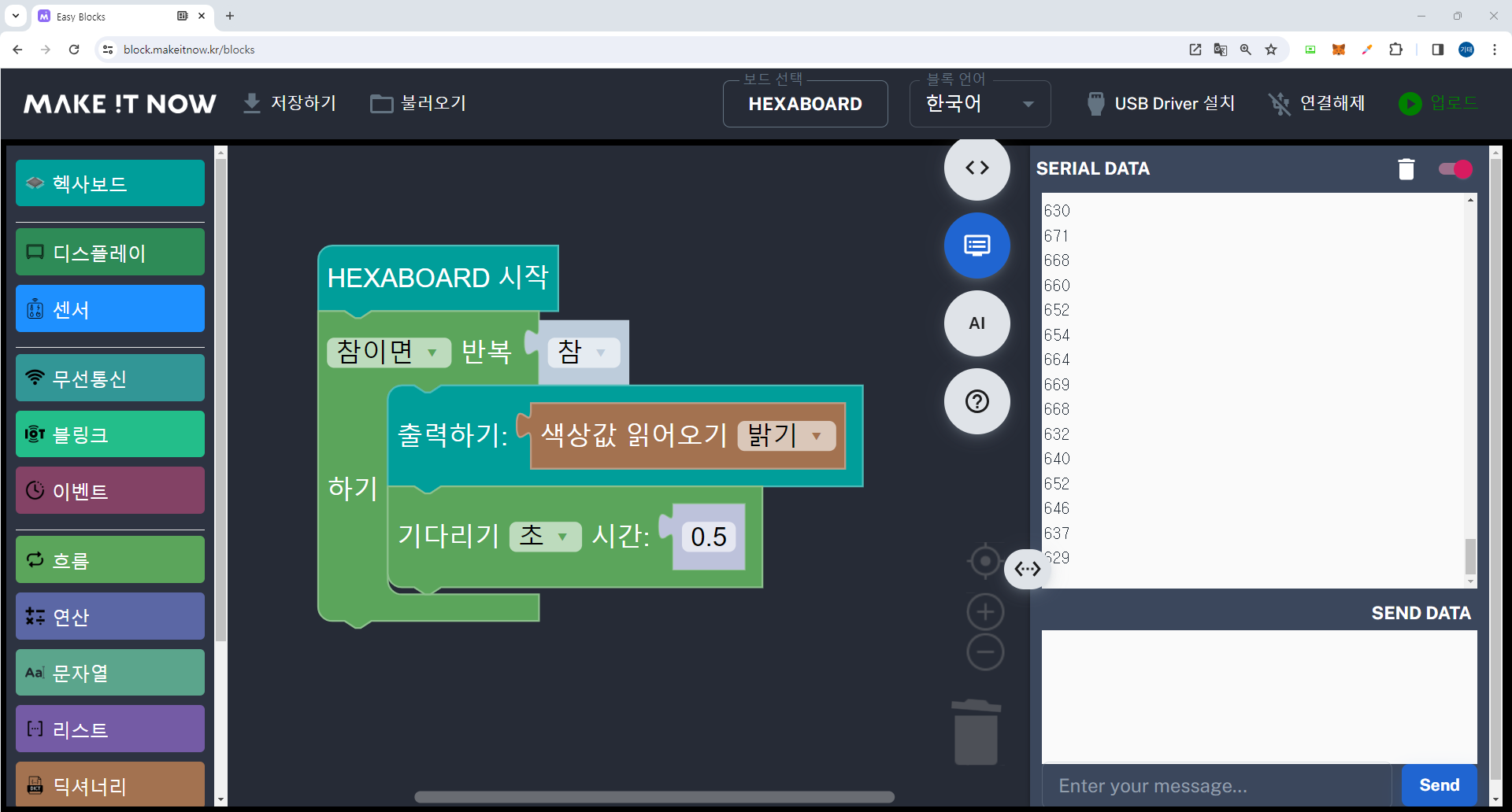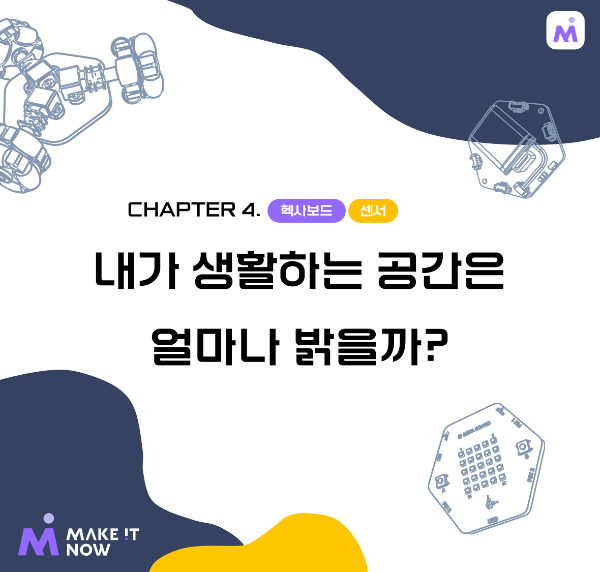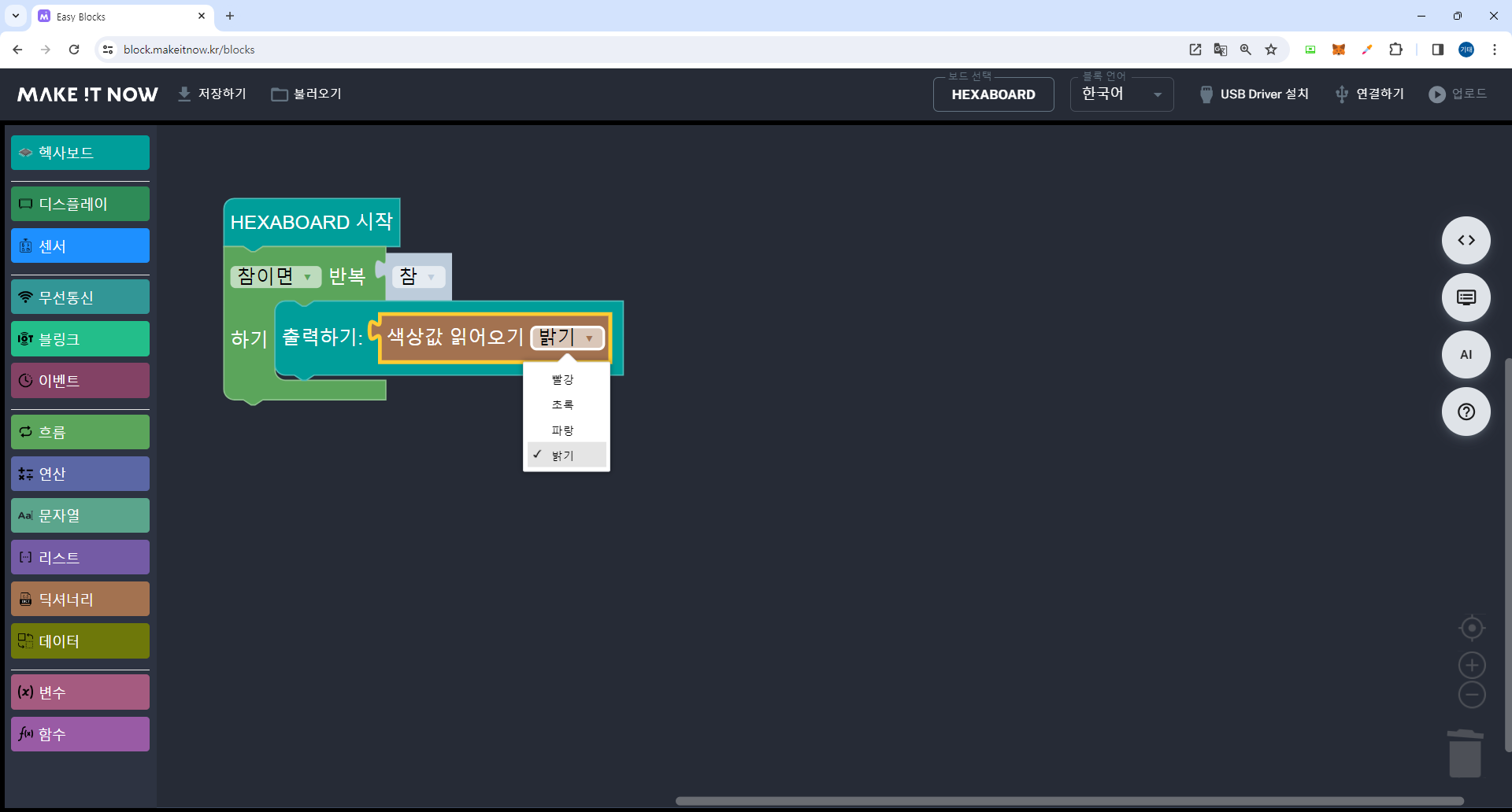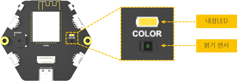 메이크잇나우의 헥사보드에 내장되어있는 컬러센서는 밝기측정센서로 활용이 가능합니다.