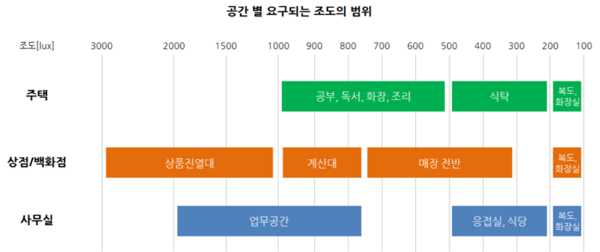 위 표를 보면, 업무공간에서는 최소 750lux 이상의 밝기를 요구하고 있습니다.