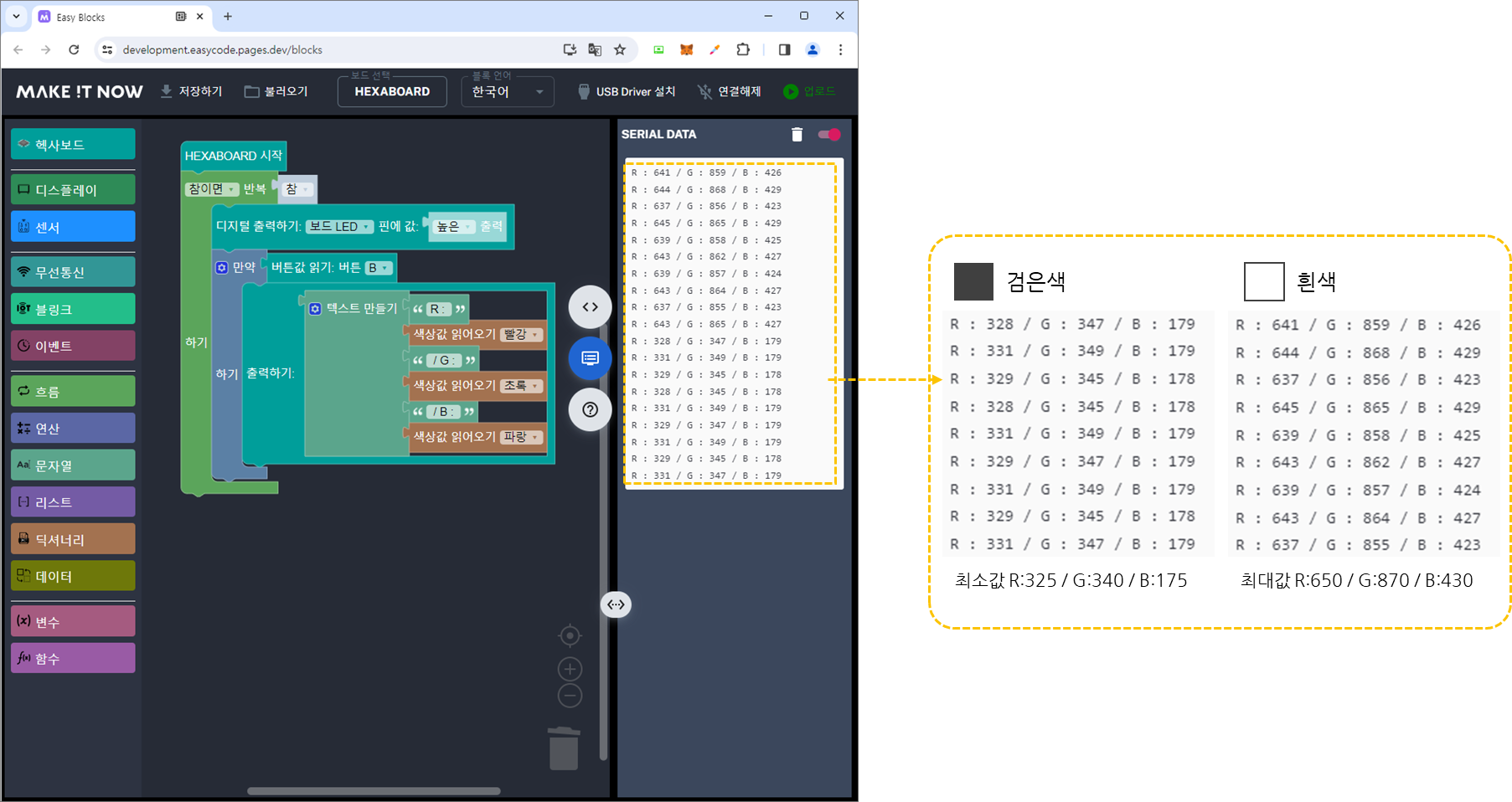 다만, 헥사보드에 있는 컬러센서는 값의 범위를 크게 측정하는 센서로, 이 값을 0~255로 변환해줘야