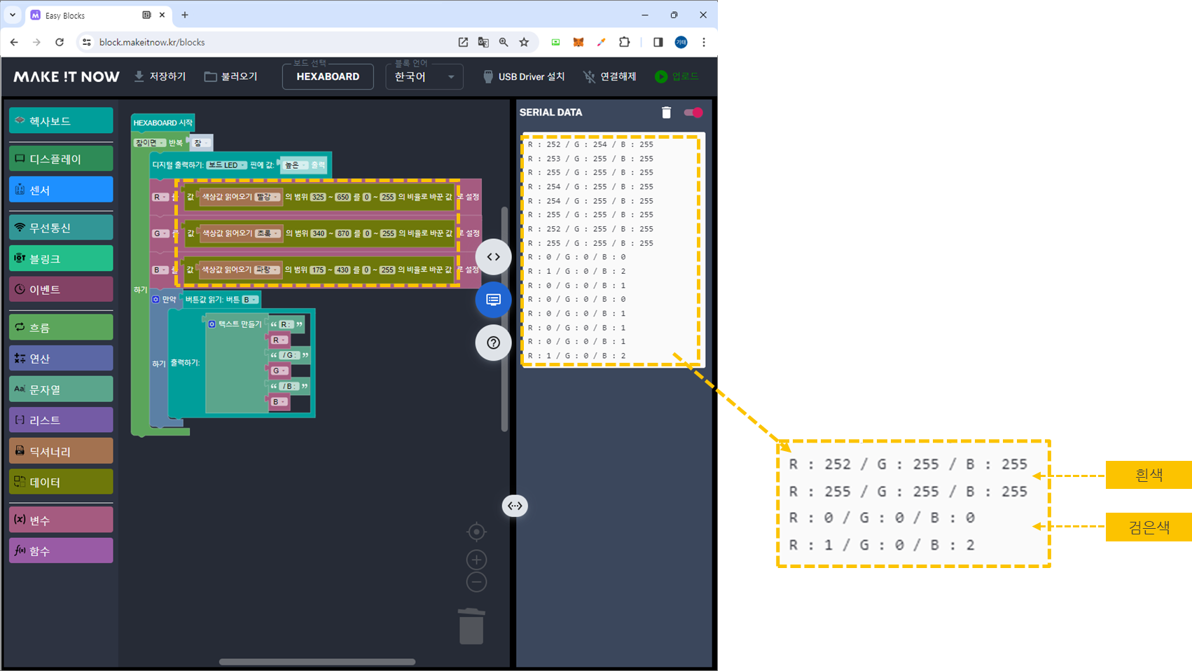 다만, 헥사보드에 있는 컬러센서는 값의 범위를 크게 측정하는 센서로, 이 값을 0~255로 변환해줘야