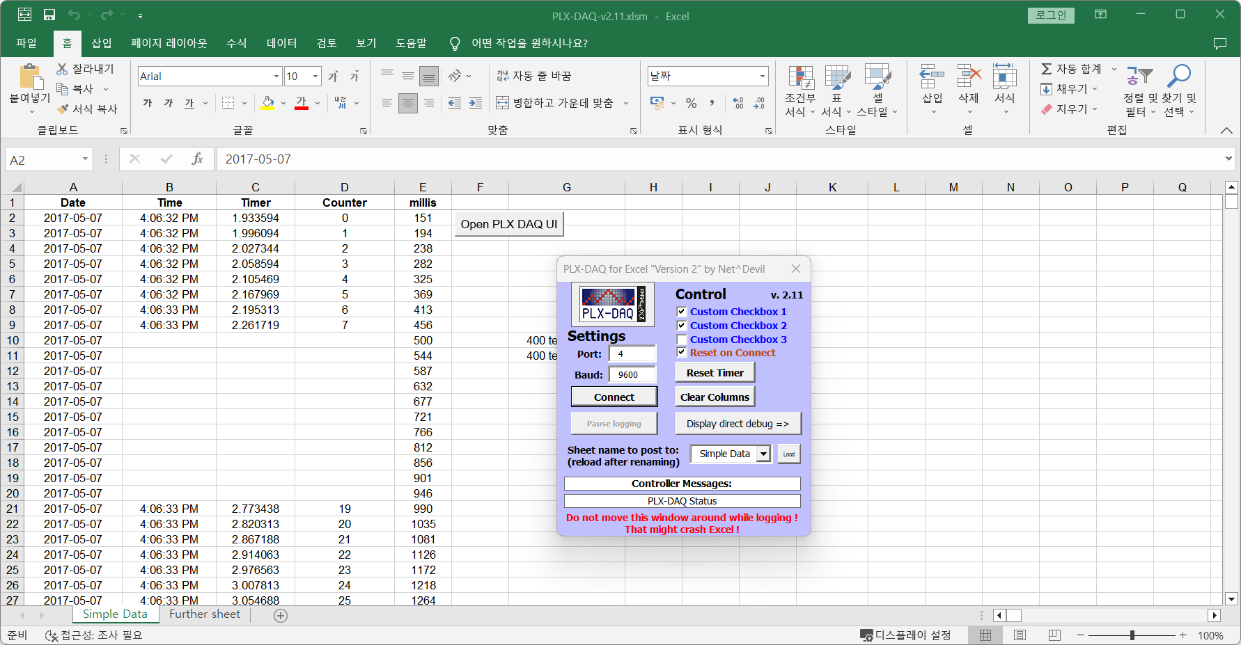 해당 엑셀에서 포트와 보드레이트를 맞추고 connect 를 누르면 엑셀 데이터가 들어오는것을 확인할 수 있습니다.