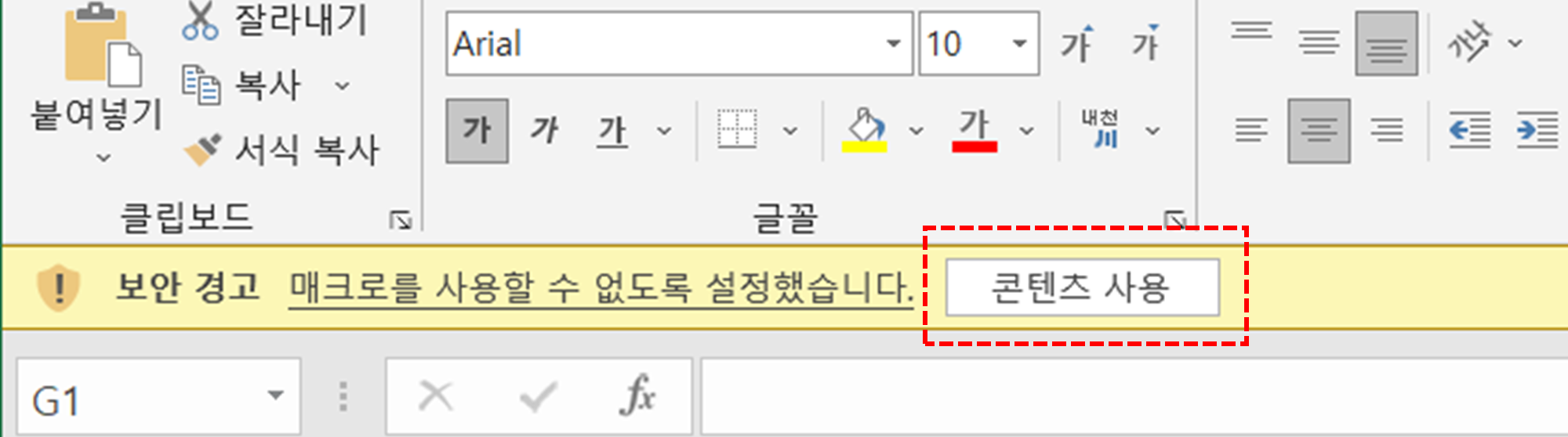 해당 프로그램을 열때 경고문이 나타날 수 있는데, 이때는 '콘텐츠 사용' 을 눌러서 사용합니다.