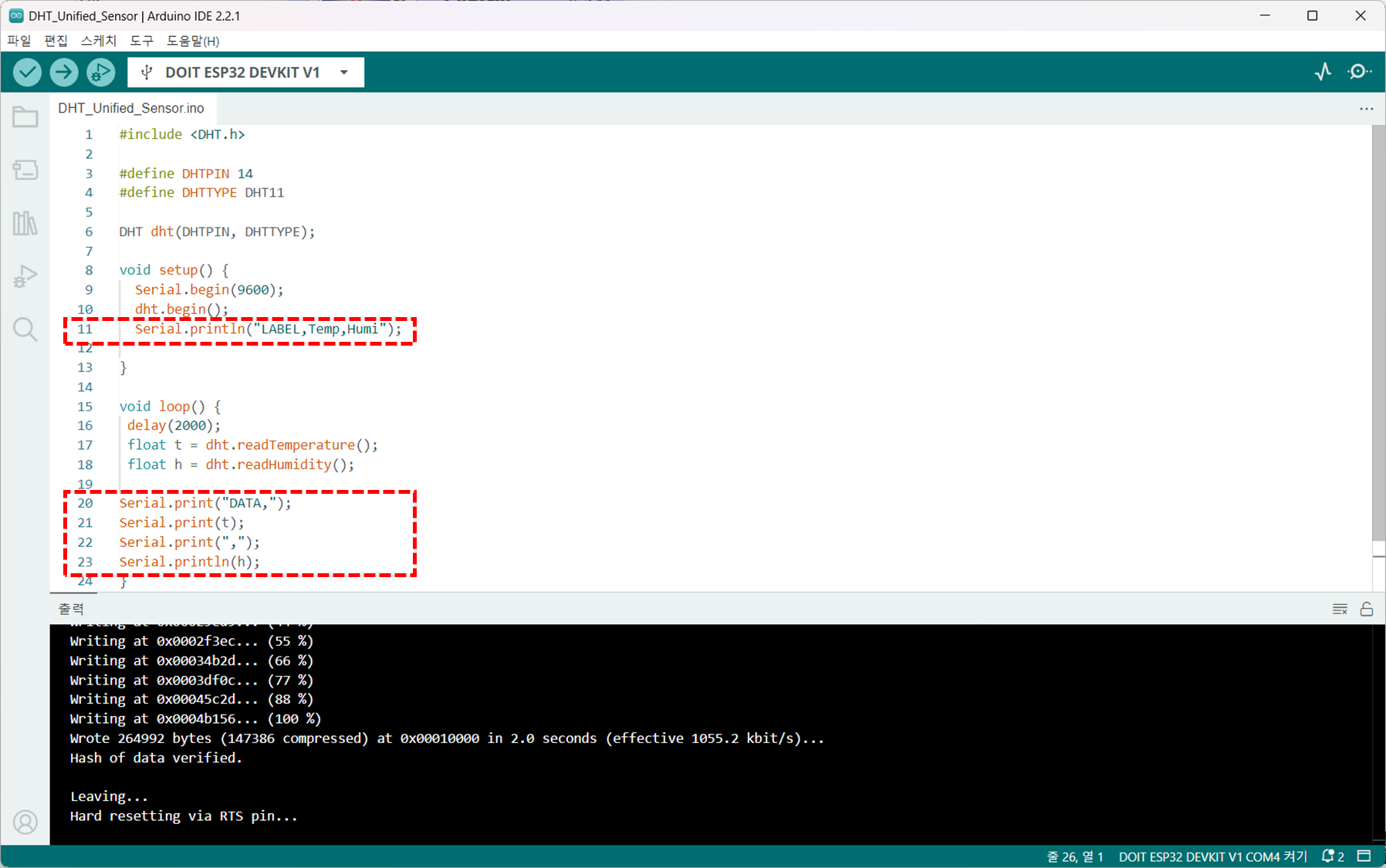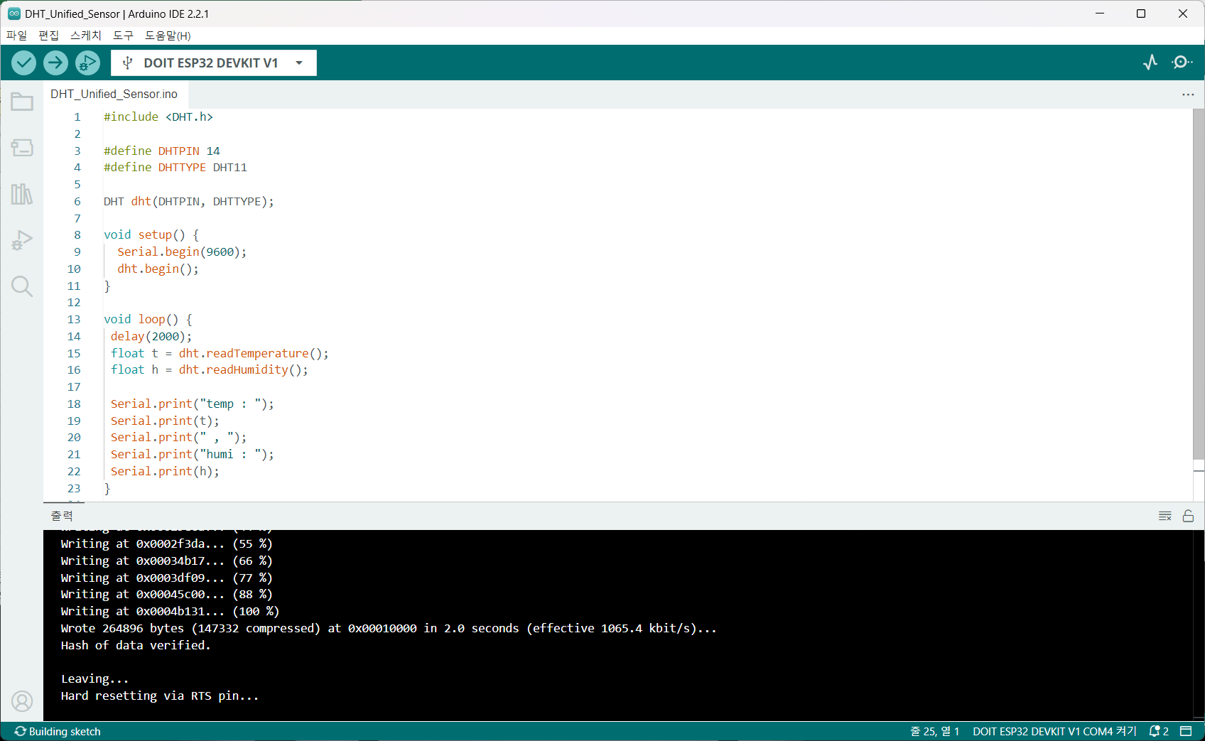 위 코드는 esp32를 활용하여 아두이노 IDE 에서 온습도 센서를 읽는 코드입니다.