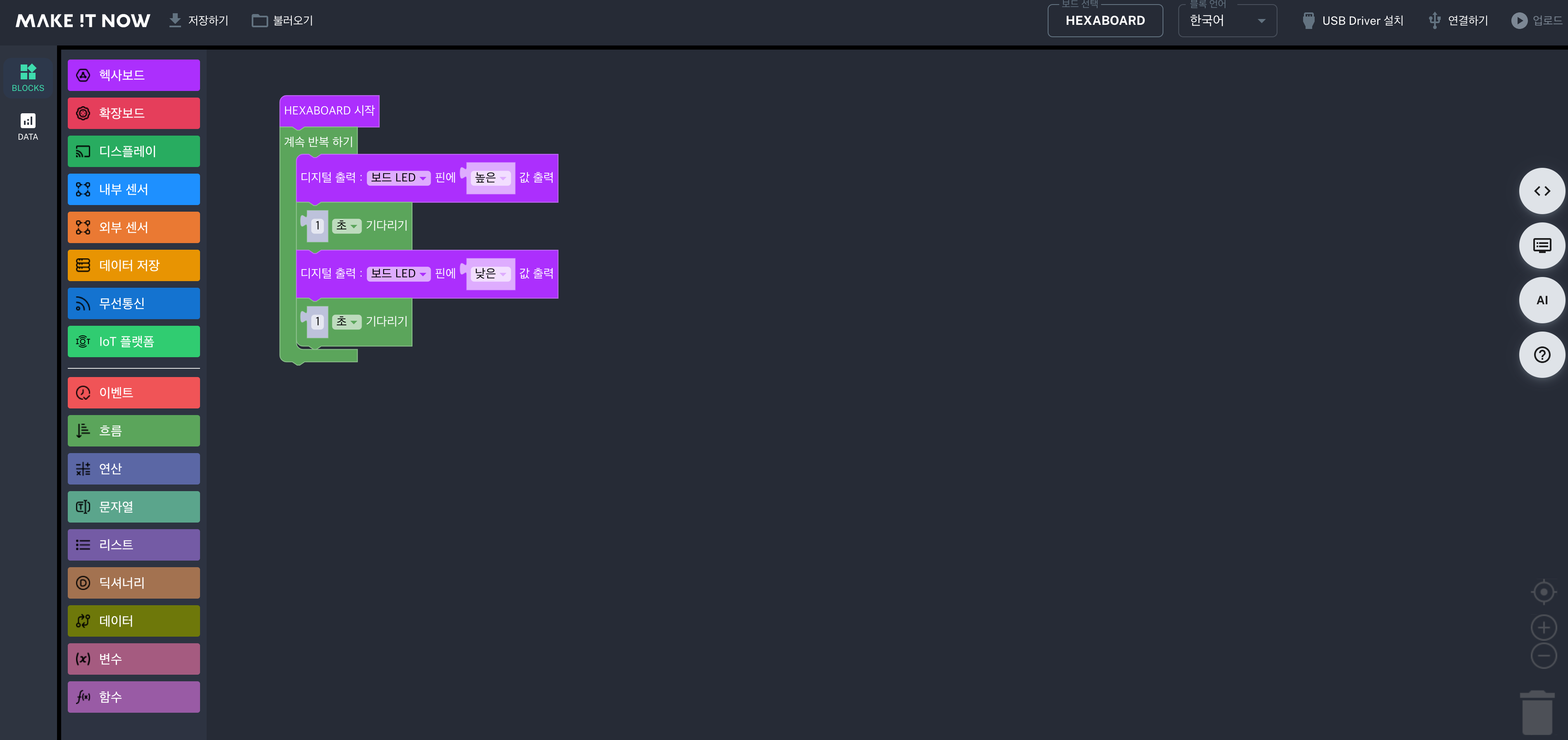 무엇보다도 헥사보드가 더 쉽고 간편하게 사용할 수 있는 장점은 웹 기반의 블록코딩 에디터 이지블록스로 모든 어려운 기능들을 블록하나로 쉽게 구현할 수 있는데요, 이지블록스에는 IoT, AI, 데이터사이언스 관련된 내용들을 블록 하나만으로 간편하게 구현 할 수 있는 장점이 있어서 아주 간편합니다.