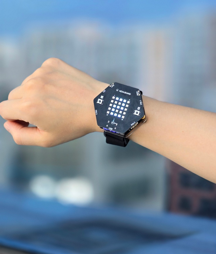 헥사보드는 5cm 정도의 크기에 5x5 네오픽셀, 자이로센서, 버저, 칼라센서, 버튼을 내장하고 있어 보드 만을 가지고도 수 많은 피지컬 컴퓨팅 수업이 가능합니다 !! 특히 저희가 만든 Easy Blocks(이지블록스)와 연계한다면 더 더운 쉽고 간편한 코딩이 가능합니다!