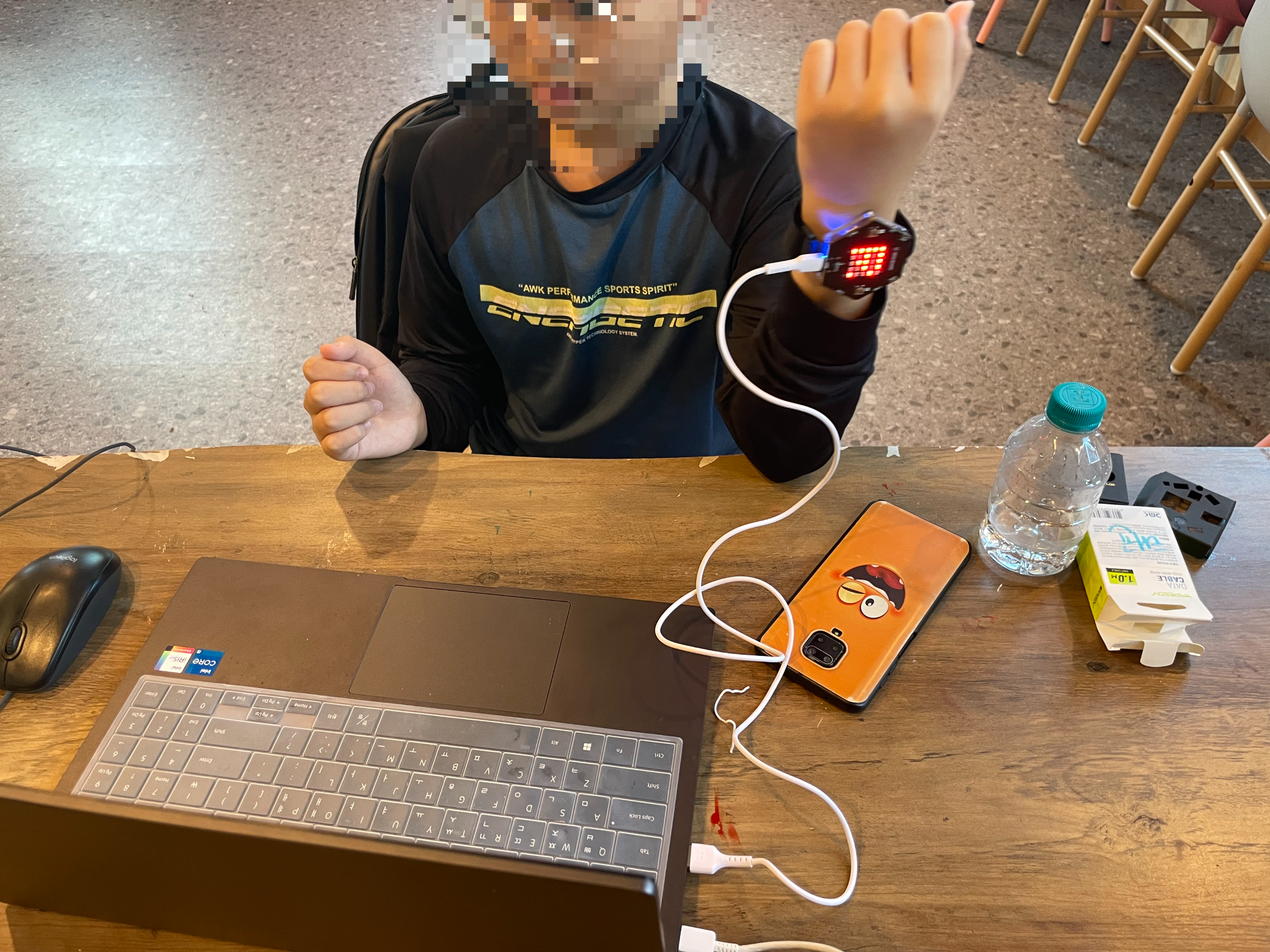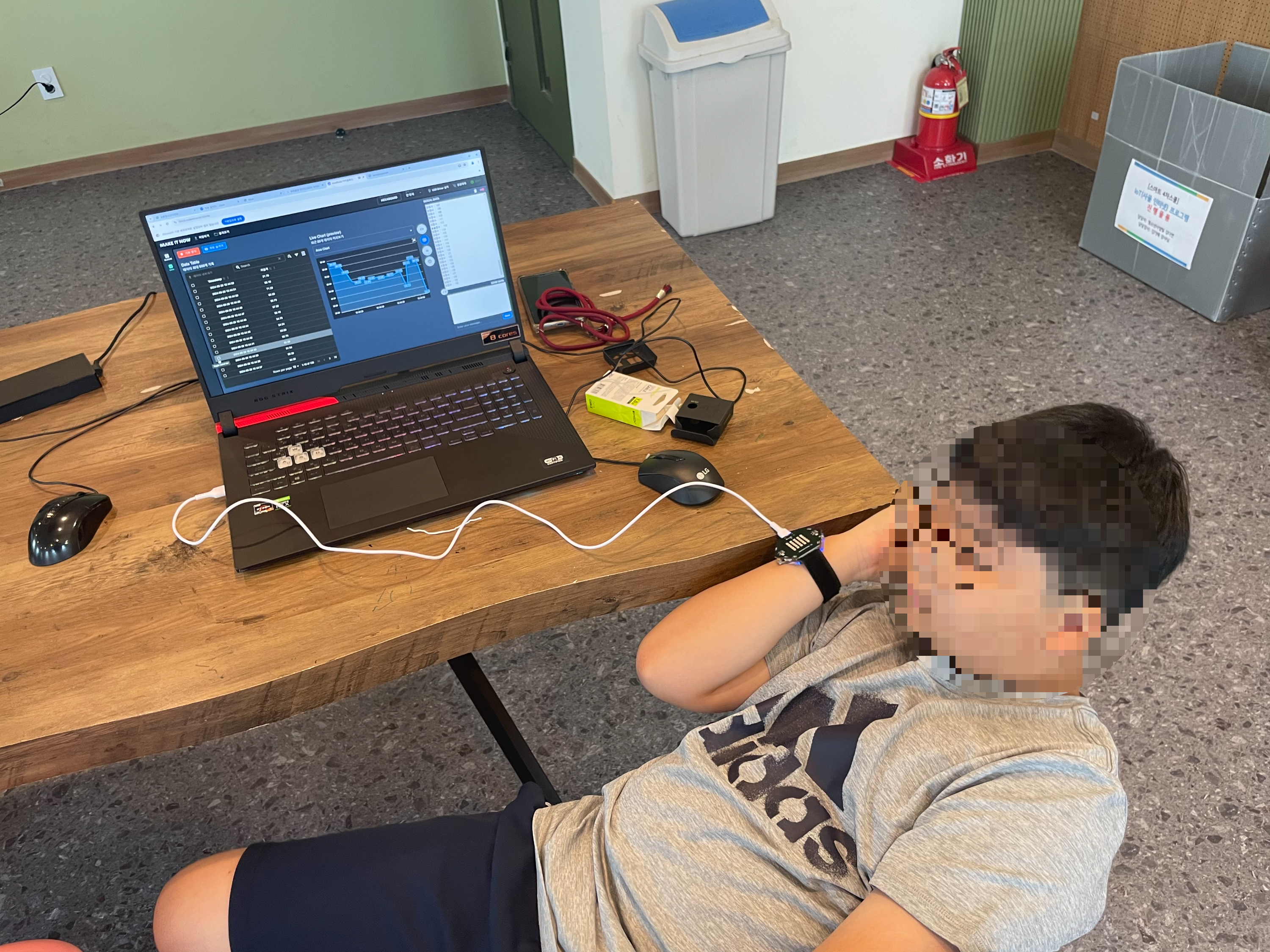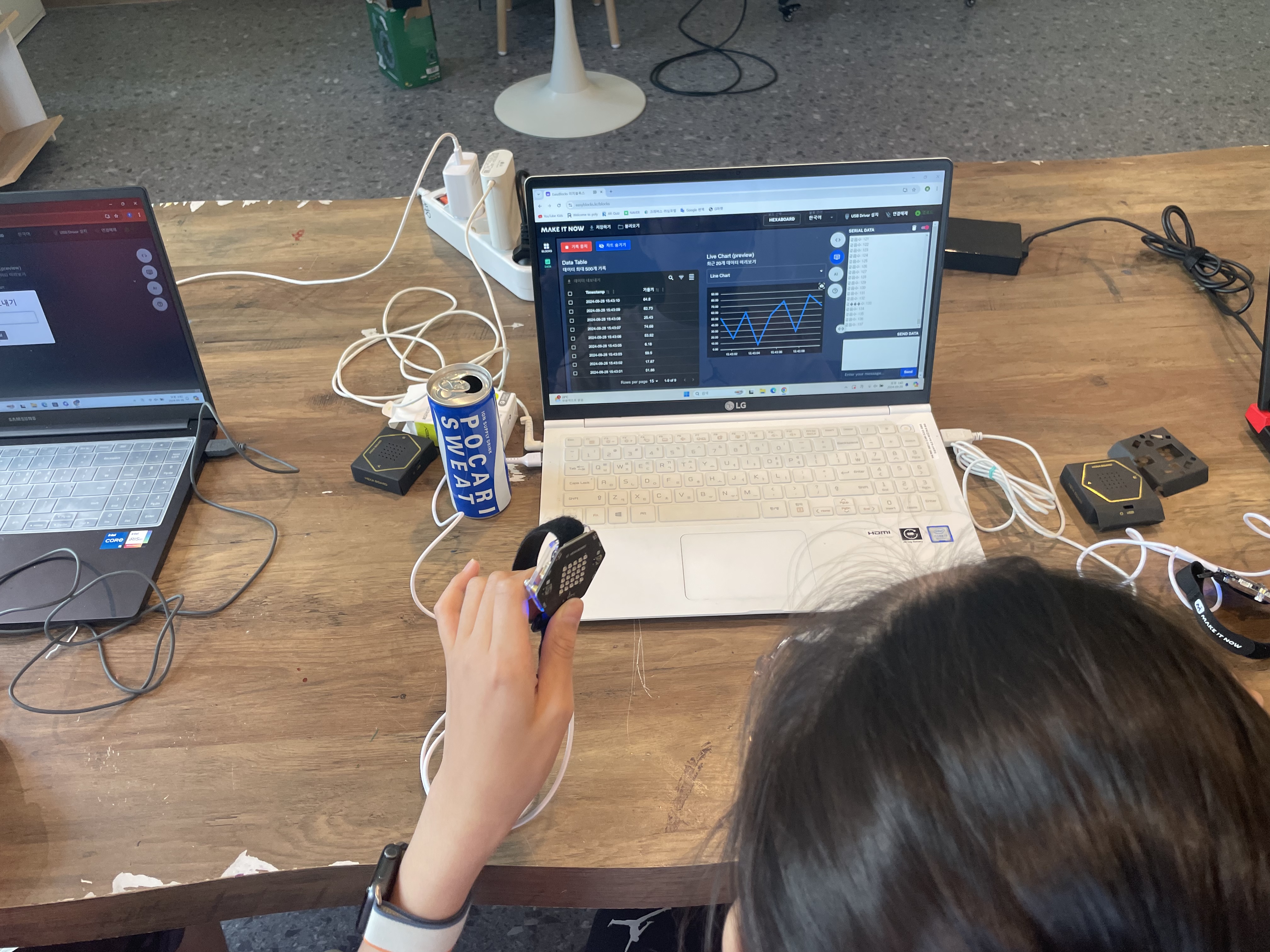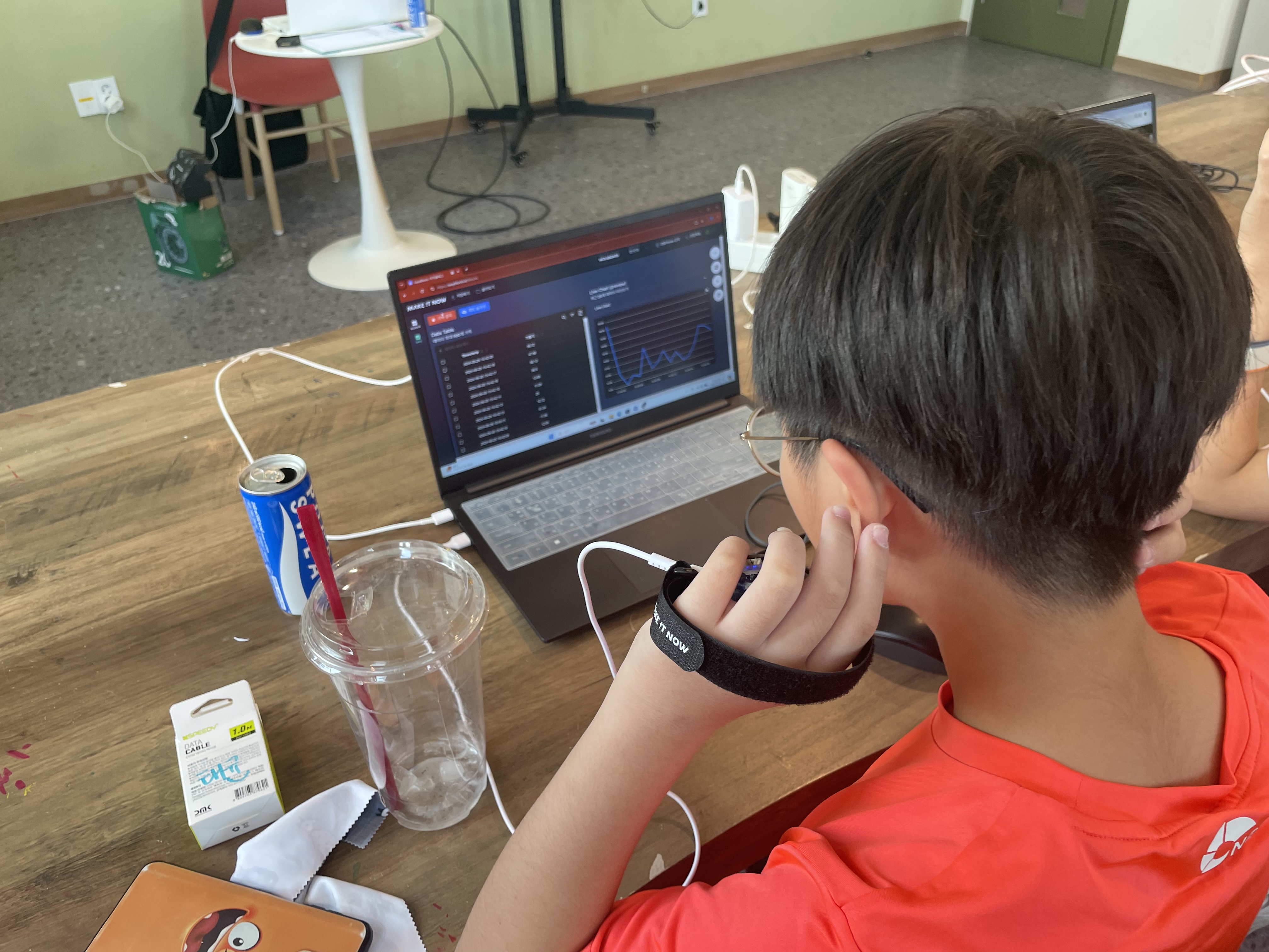 친구들이 팔목에 헥사보드를 차고 데이터를 수집하고 있네요.
