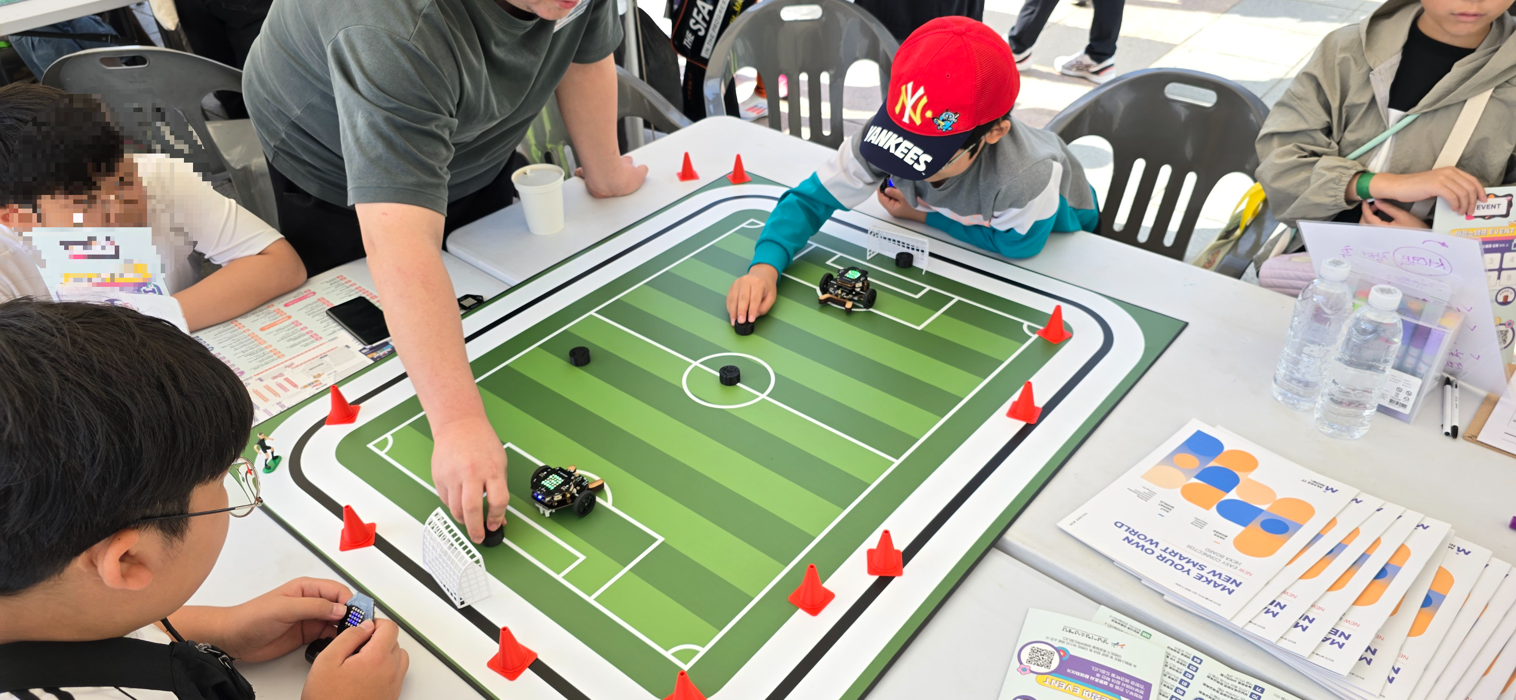 성남청소년창의과학축제에서 헥사보드 스마트 모빌리티 키트를 활용한 로봇 축구 체험을 진행했습니다! 😊