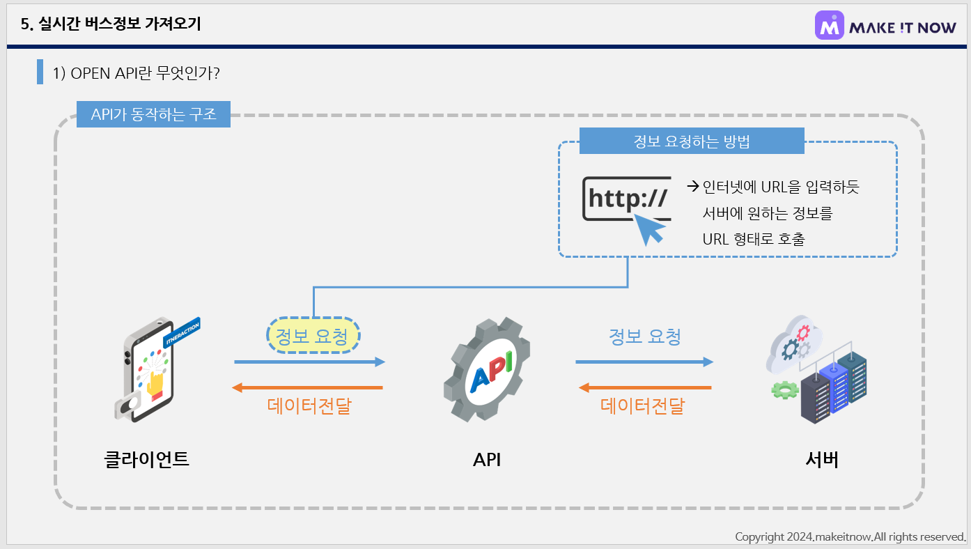 API는 기본적으로 URL의 형태로 호출을 하며, 이 안에 원하는 정보를 담아서 호출하는것이 가능합니다.