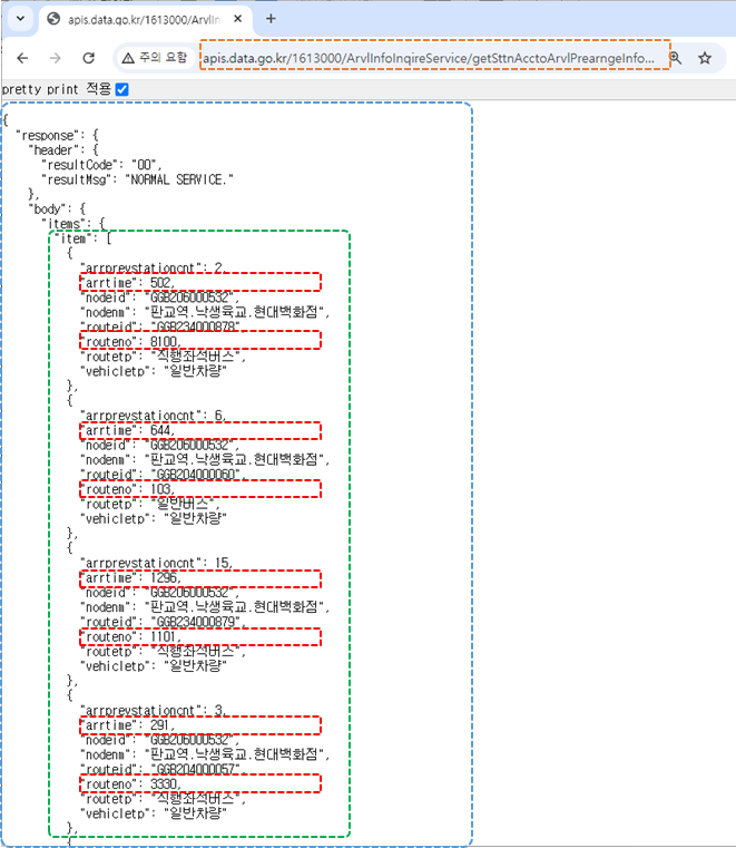 URL을 통해 정보를 요청하면, 내가 지정한 버스정류장으로 향하는 모든 버스의 정보가 들어옵니다.
