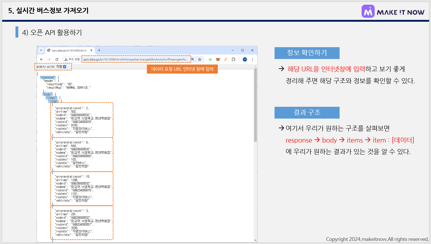 안녕하세요~ 메이크잇나우 입니다.오늘은 저희 버스정류장에서 사용하고 있는공공데이터 API를 가져오는 방법을 같이 알아볼까요? ■ 공공데이터 API 버스정류장버스나 지하철 등 대중교통을 많