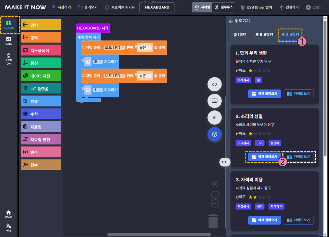 헥사보드와 이지블록스를 활용하여 손쉽게 실험하고 데이터를 얻어보도록 하겠습니다.