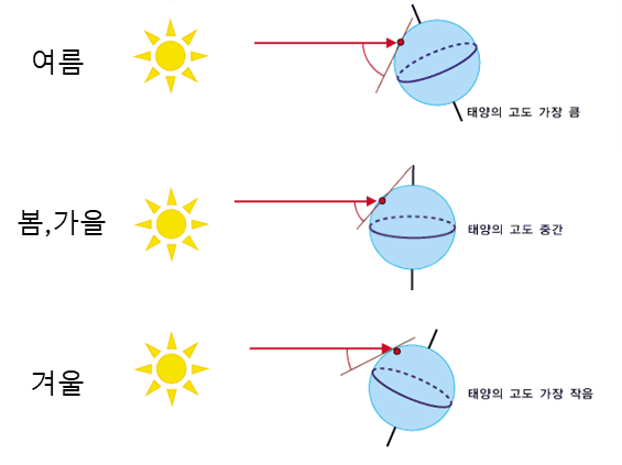 이에 따라 태양의 고도가 달라지면서, 동지와 하지가 생겨나게 됩니다.
