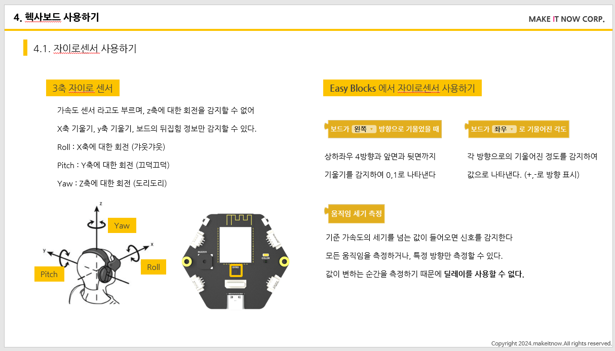 헥사보드에는 기본적으로 GYRO센서가 내장되어 있습니다.