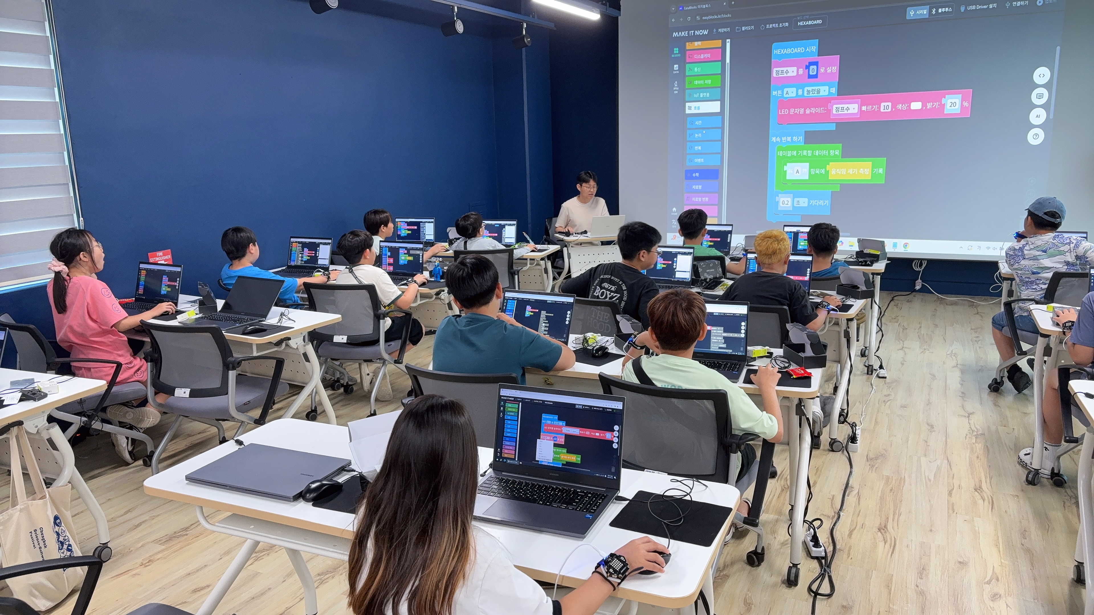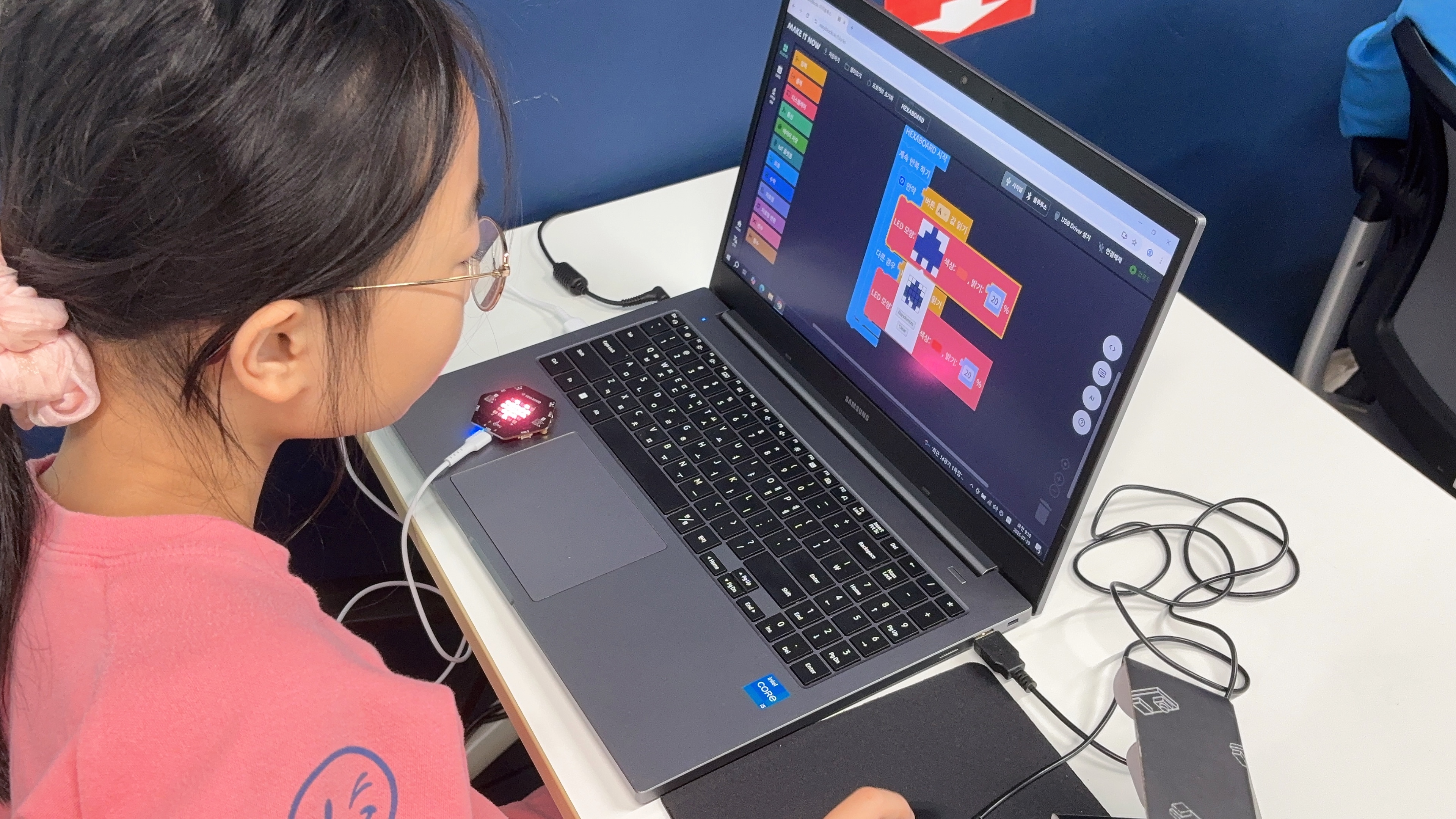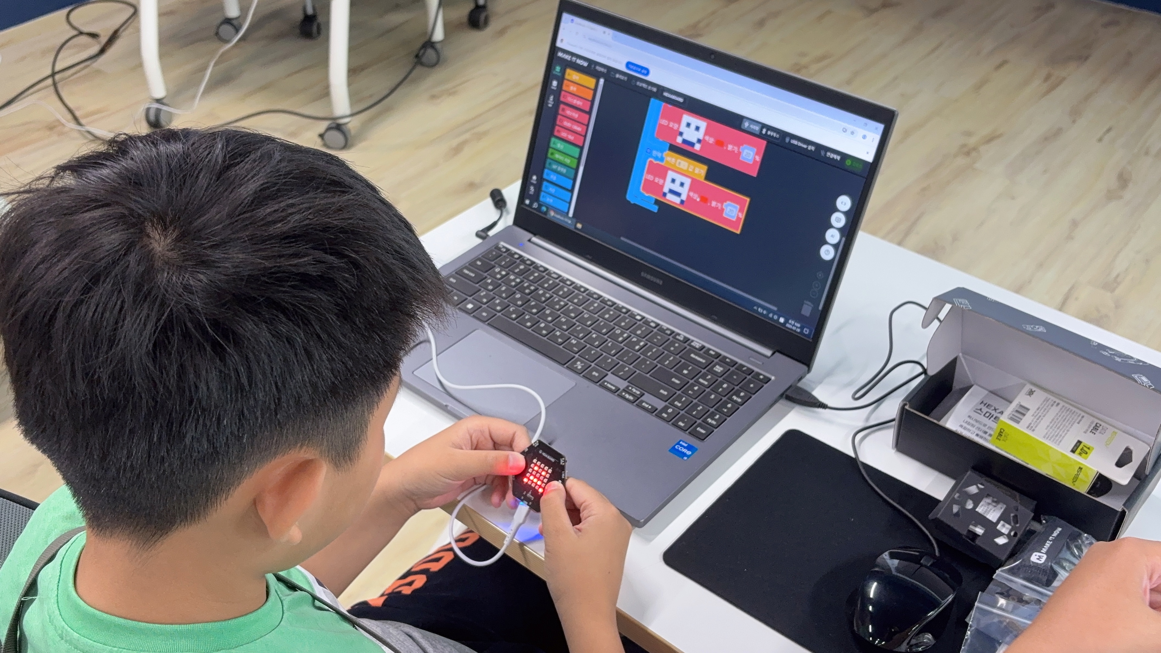 안녕하세요~ 메이크잇나우 입니다.저희가 일주일간 충북테크노파크에서 헥사보드를 활용한 스마트워치 만들기 수업을 진행합니다.윗몸일으키기, 스쿼트, 팔굽혀펴기, 덤벨 같은 다양한 운동을