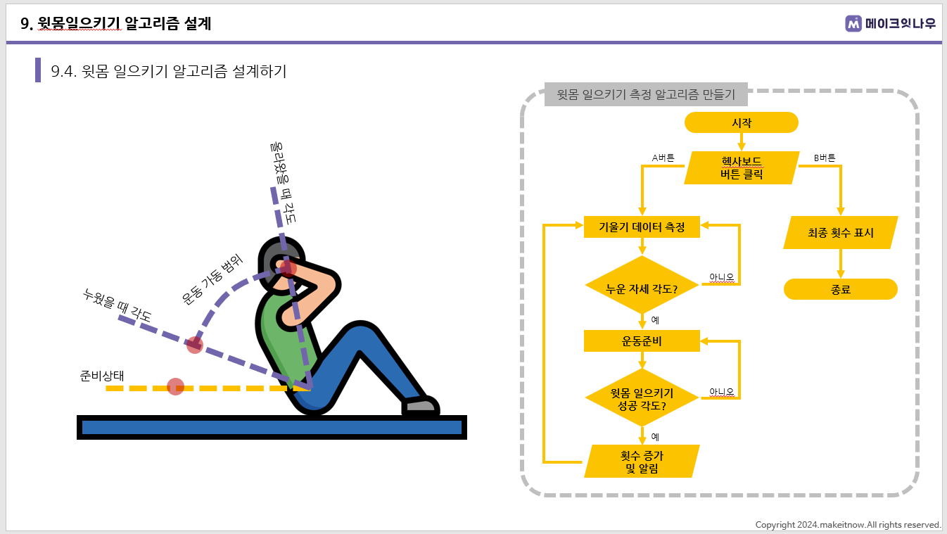 워치로 윗몸일으키기 운동을 측정하려면 자이로 센서의 기울기를 활용합니다.