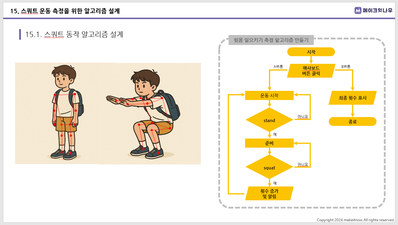 안녕하세요~ 메이크잇나우 입니다.헥사보드 스마트워치를 활용하여 운동데이터 측정하기 4일차 입니다.오늘부터는 AI 이미지인식을 활용하여 스쿼트 운동하는 데이터 뿐만 아니라정확한 자세