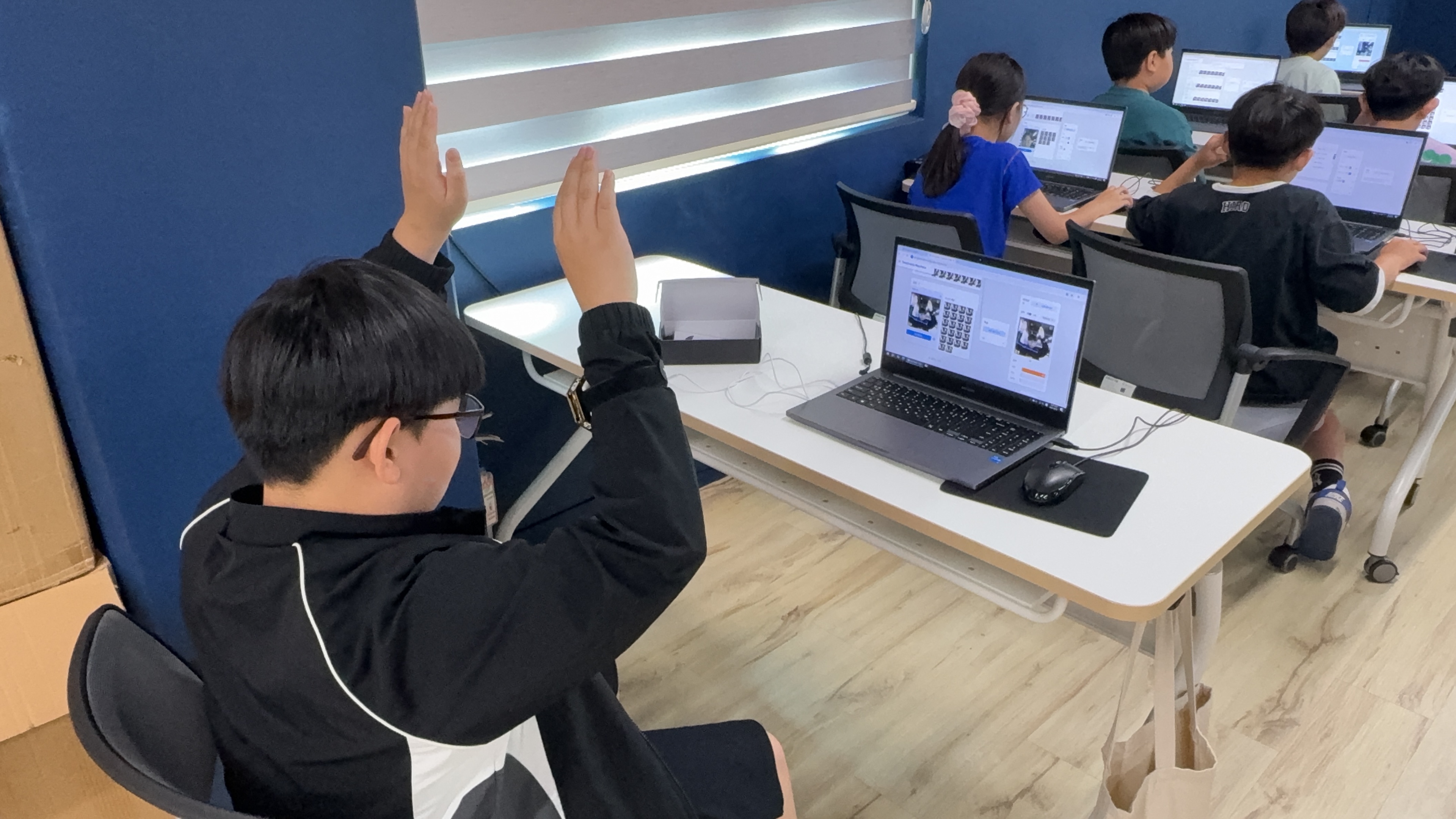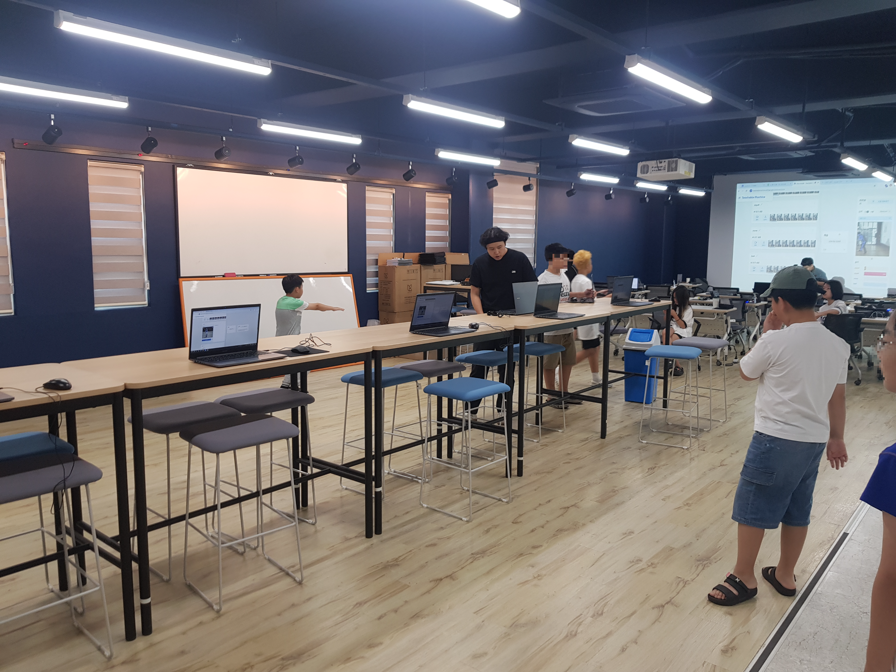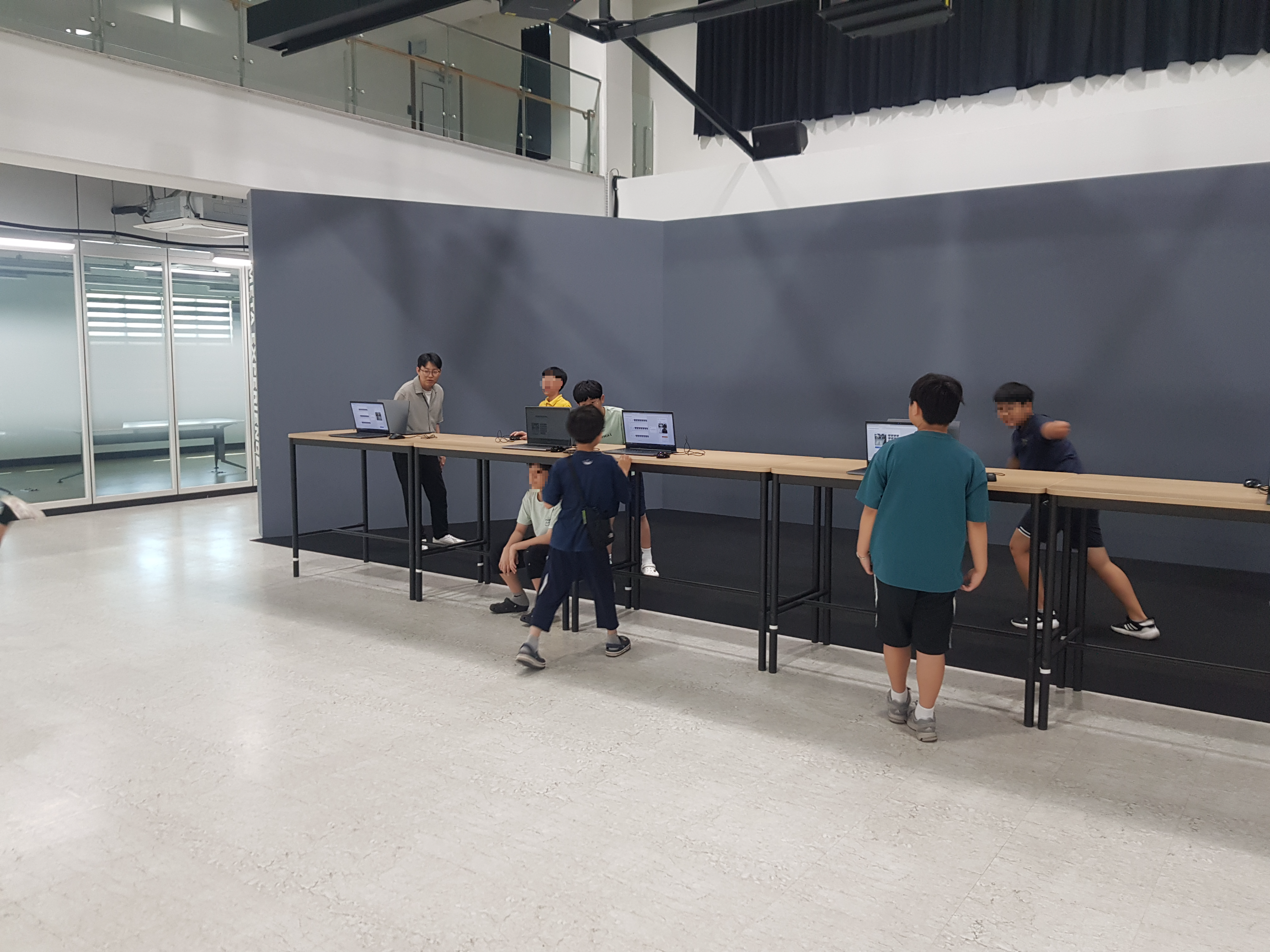 넓은 공간에 학생들이 컴퓨터 카메라를 활용하여 포즈를 인식할 수 있도록 마련해 놨어요.