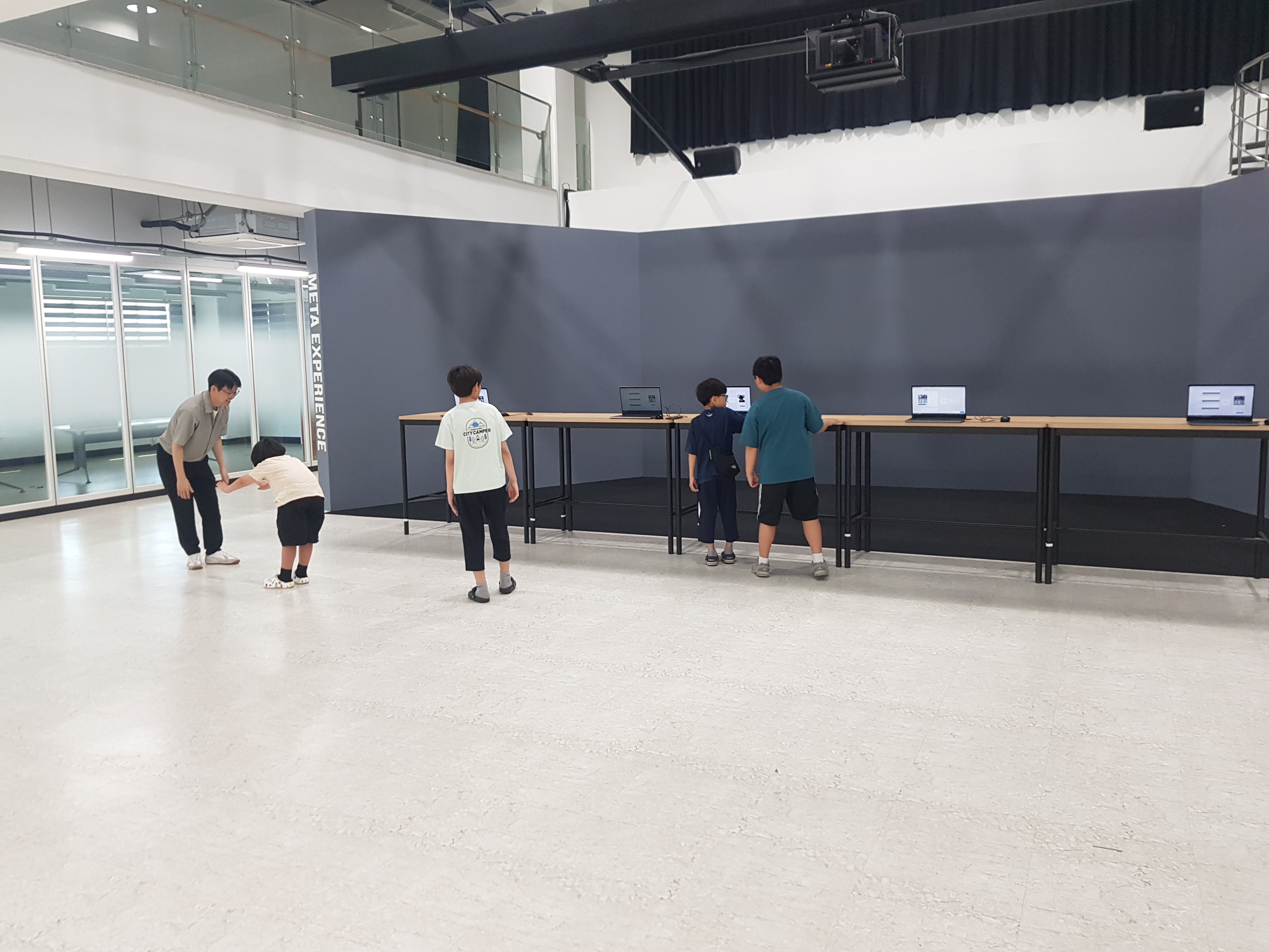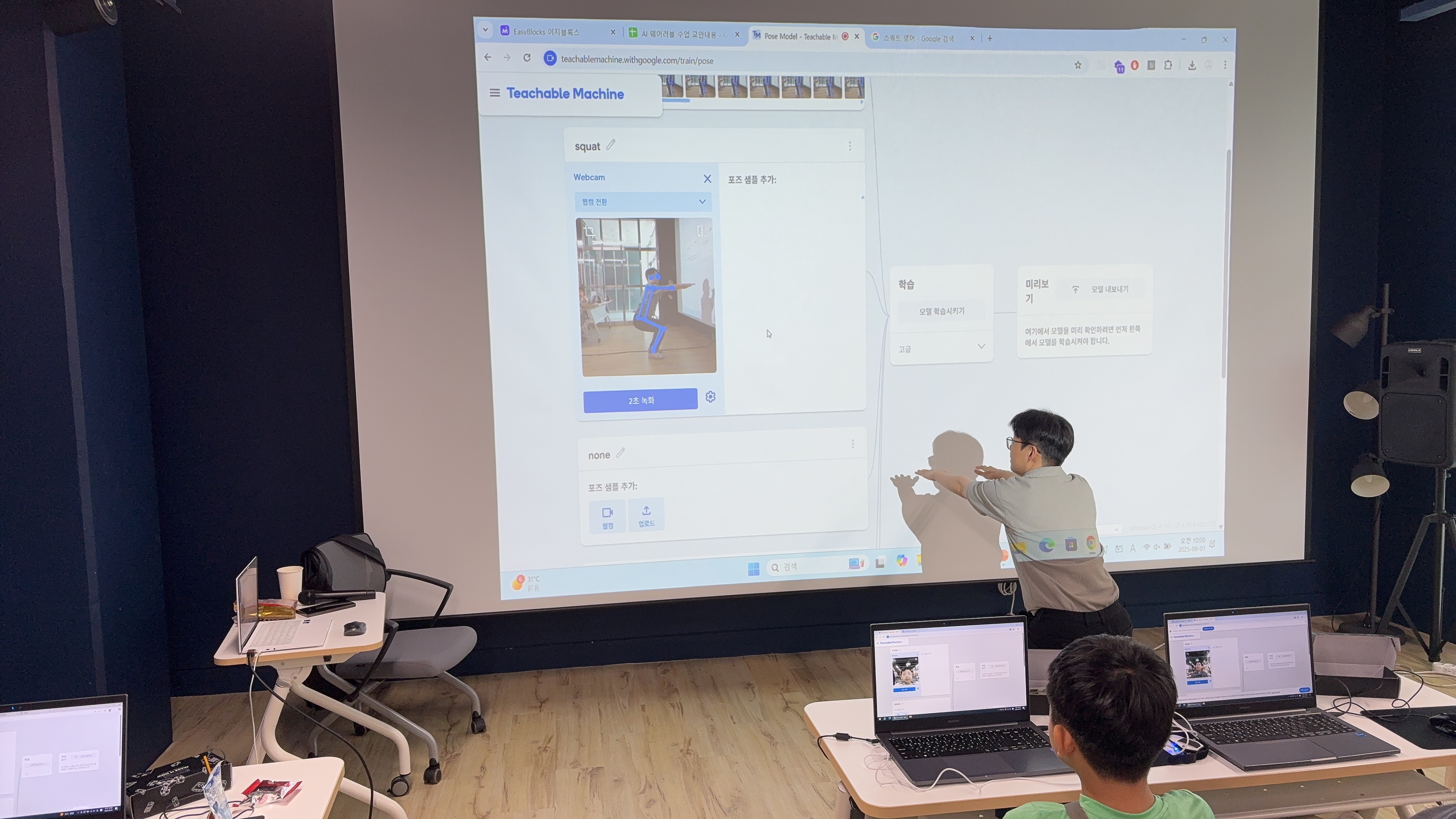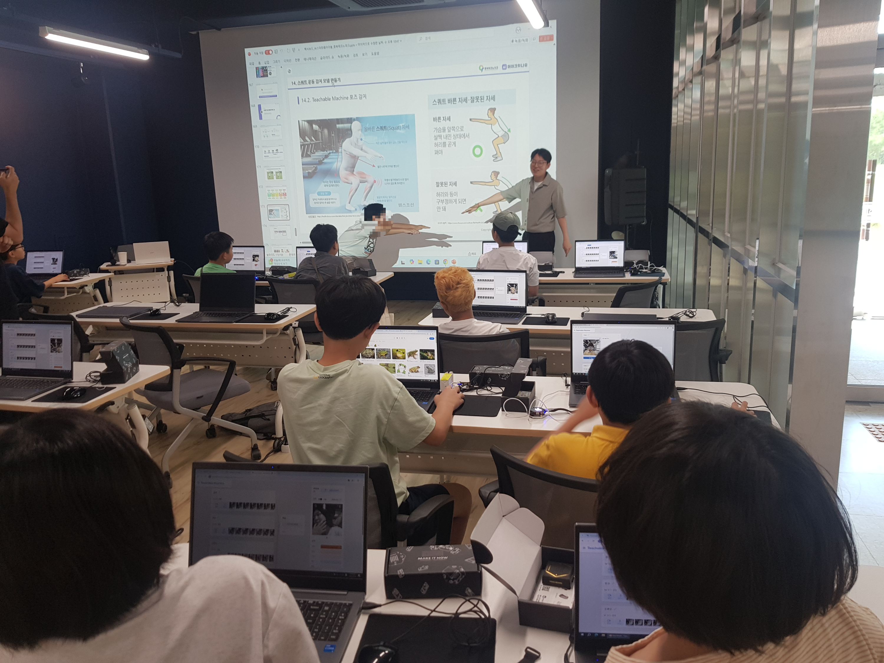 넓은 공간에 학생들이 컴퓨터 카메라를 활용하여 포즈를 인식할 수 있도록 마련해 놨어요.