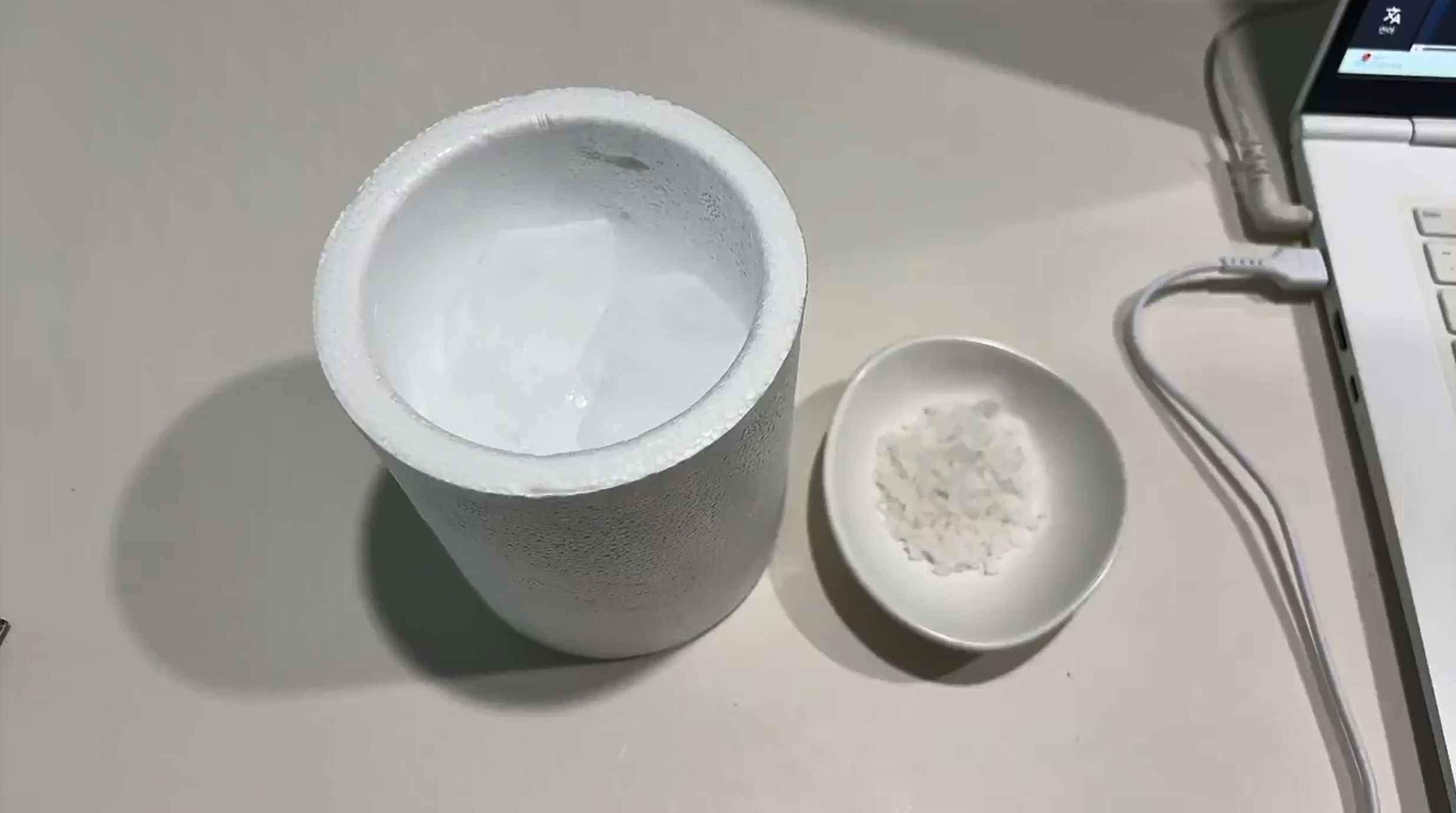 2. 스타이로폼 비커에 얼음과 소금을 넣은 후 물 얼리기