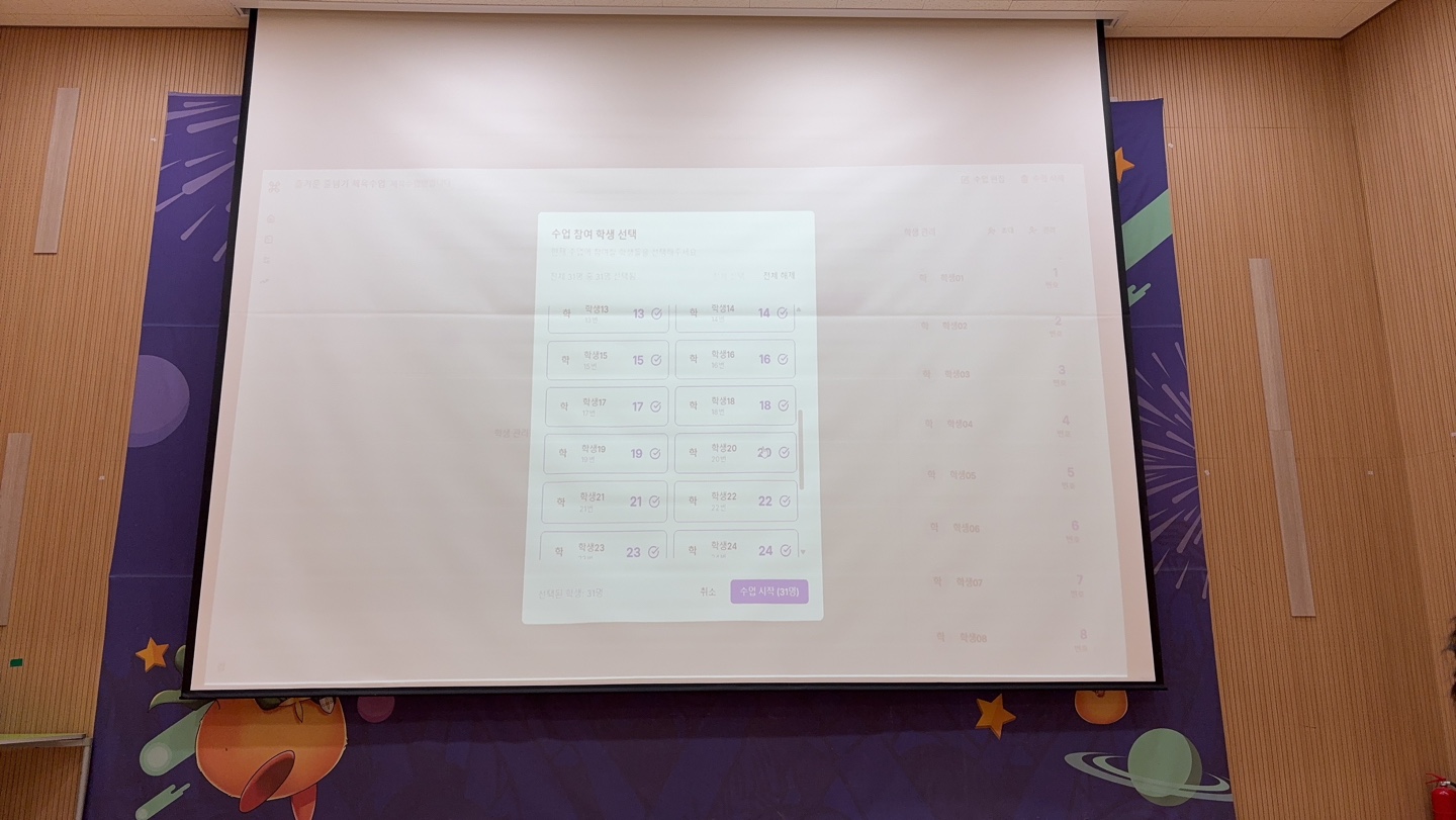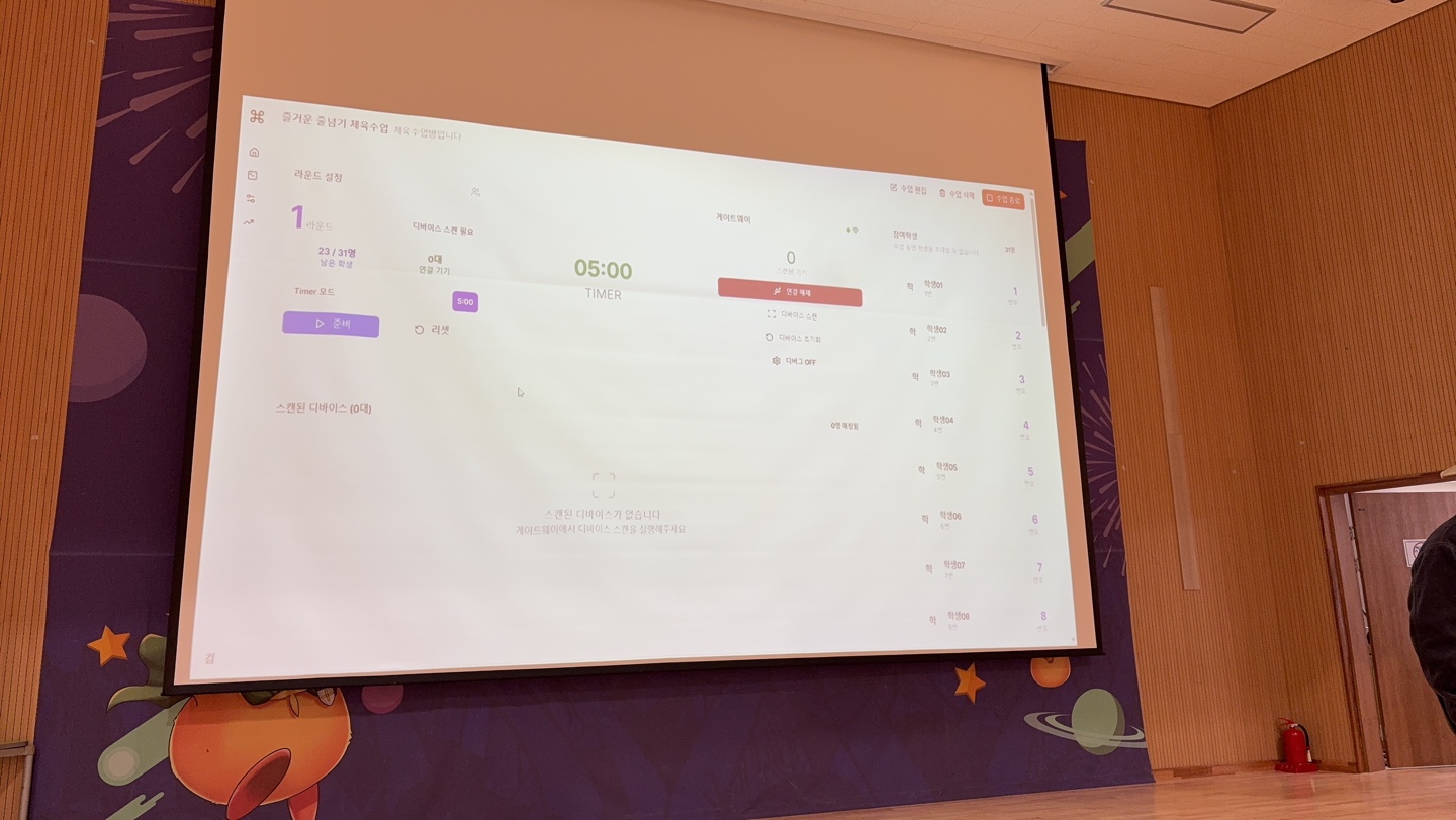 학생들이 줄넘기를 하면 실시간으로 앞의 화면에서 수량이 나오고