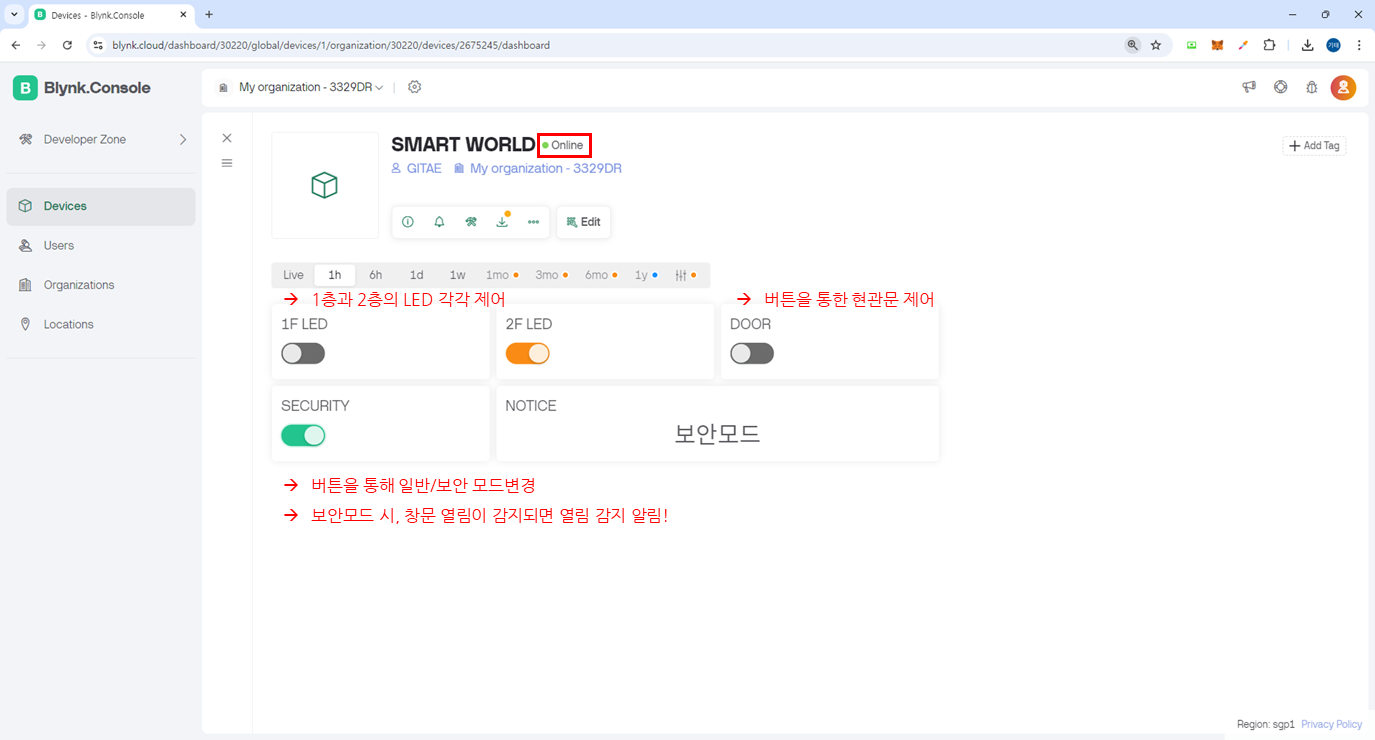 아쉬운대로, 저희 수업할때 사용했던 Blynk 웹 화면을 공유드립니다.