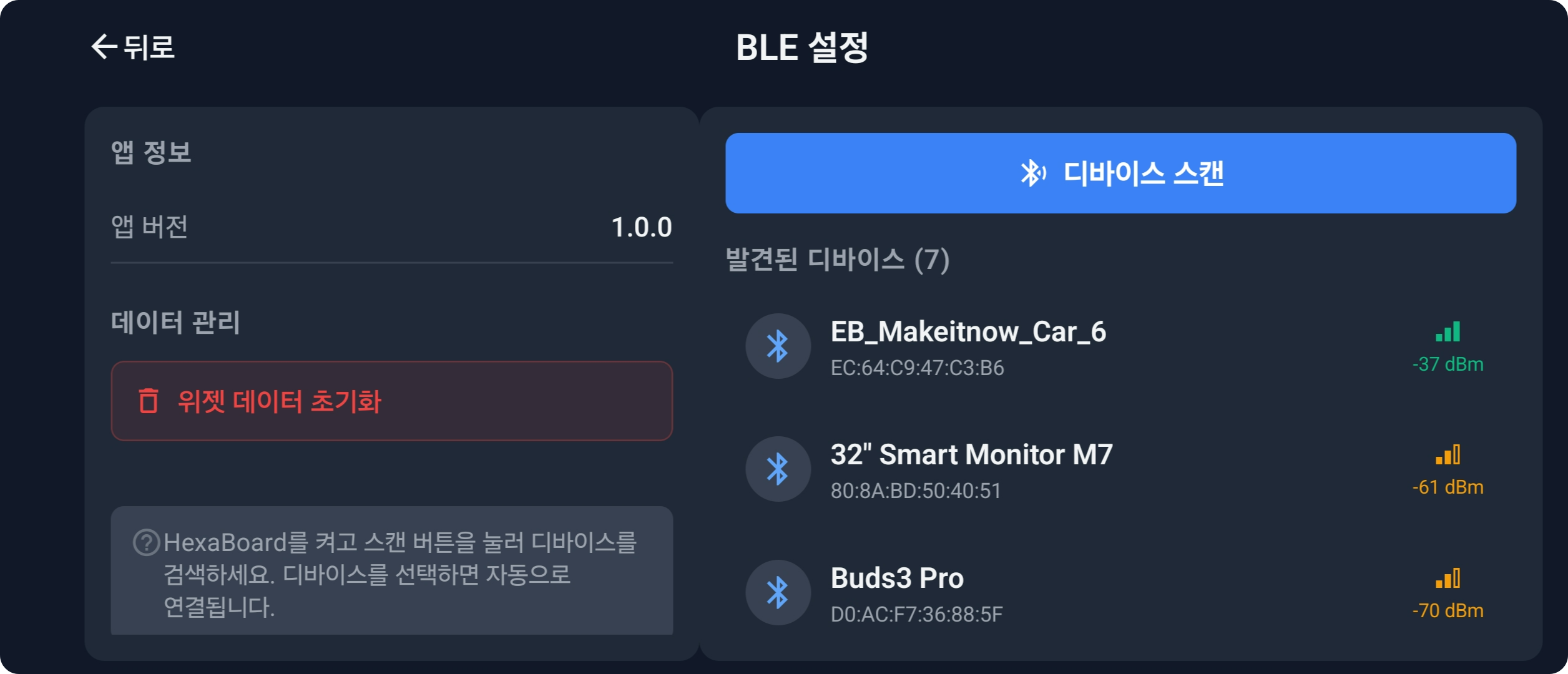 블루투스 연결 버튼을 누르면 주변에 연결 가능한 헥사보드 장치를 검색할 수 있습니다.