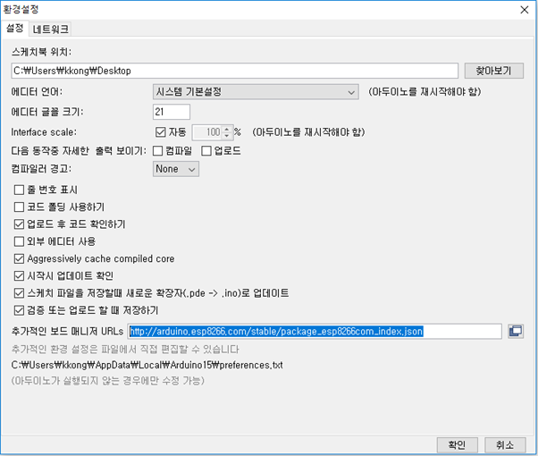 파일 – 환경설정 – ‘추가적인 보드 매니저 URLs’에 http://arduino.esp8266.com/stable/package_esp8266com_index.json을 입력하고 ‘확인’을 눌러 환경설정을 적용시킵니다.