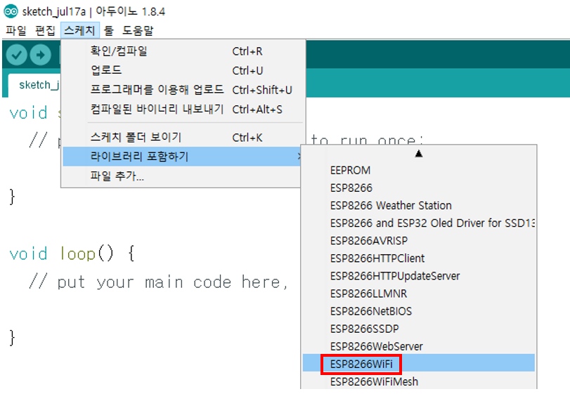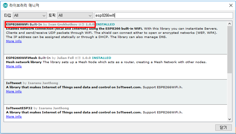 그에 앞서 ESP8266WiFi라는 라이브러리를 받아야 합니다.