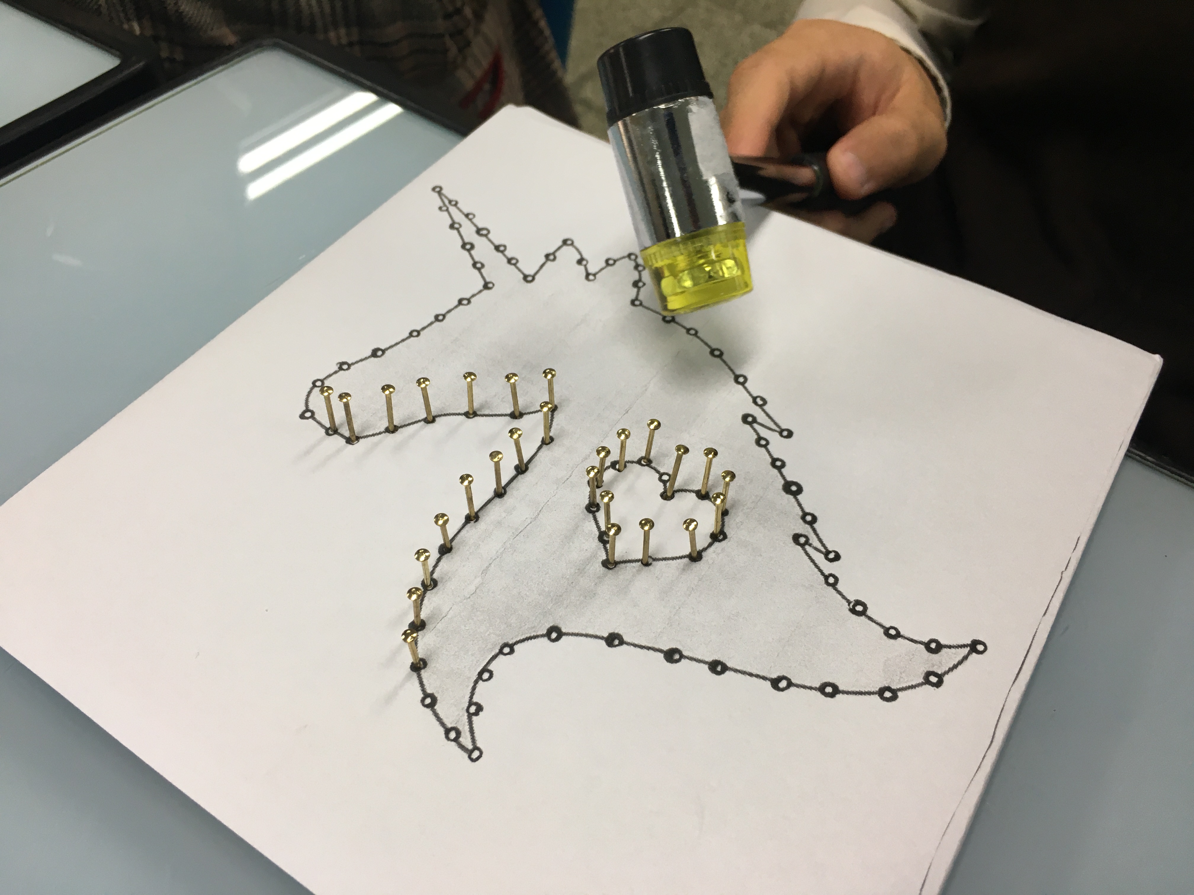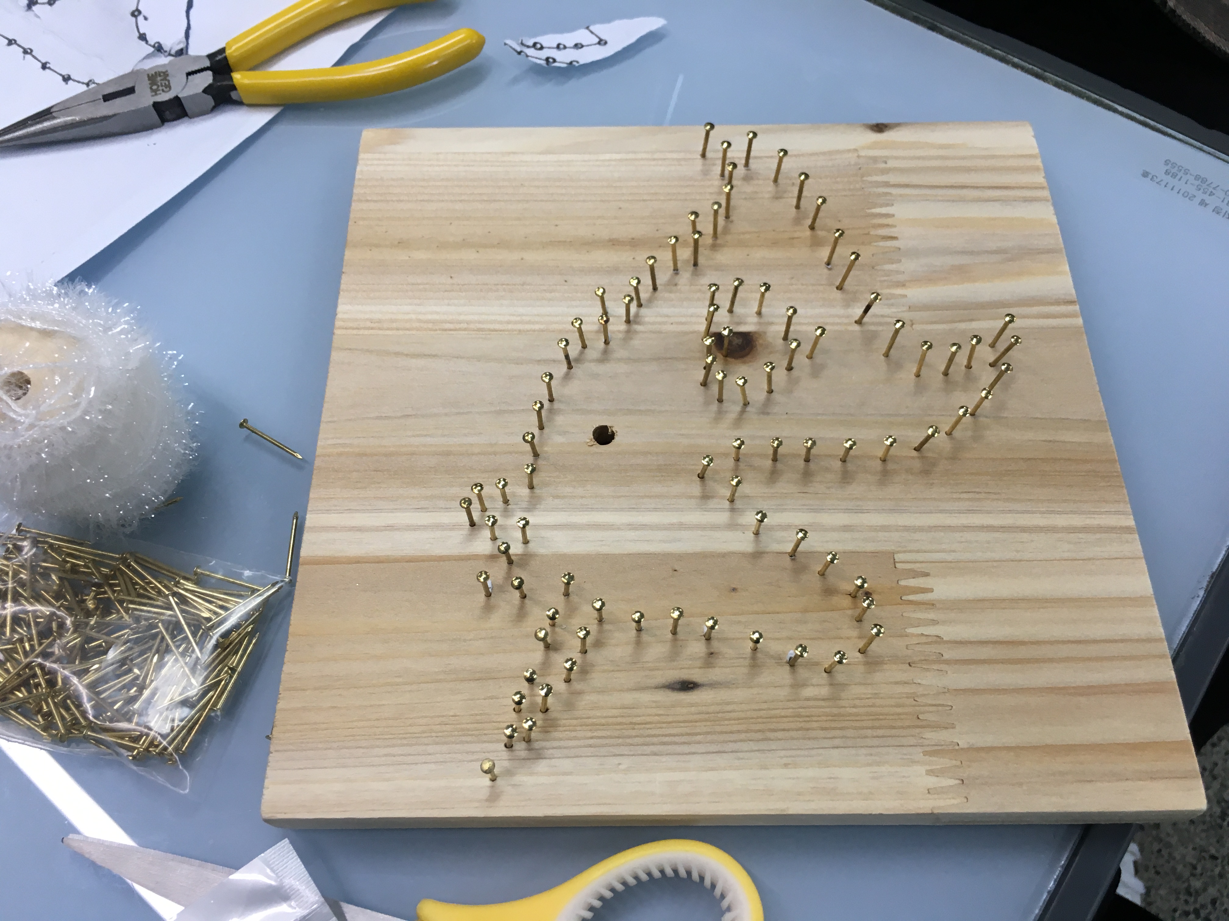 스트링아트는 원하는 위치에 못을 박아 꼭지점을 만들고, 그 꼭지점들을 실로 이어주면서 면을 만들어 채우기도 하는