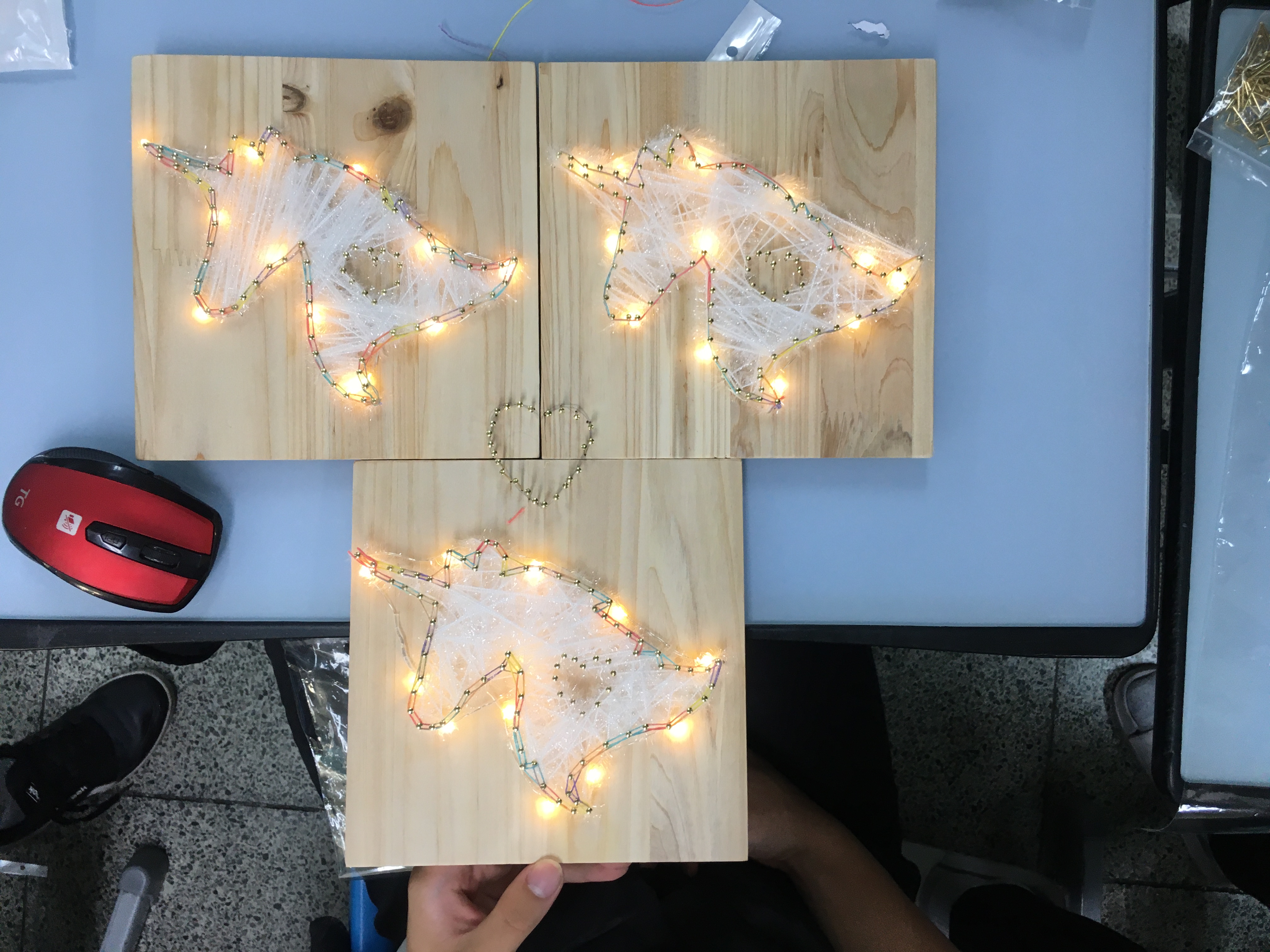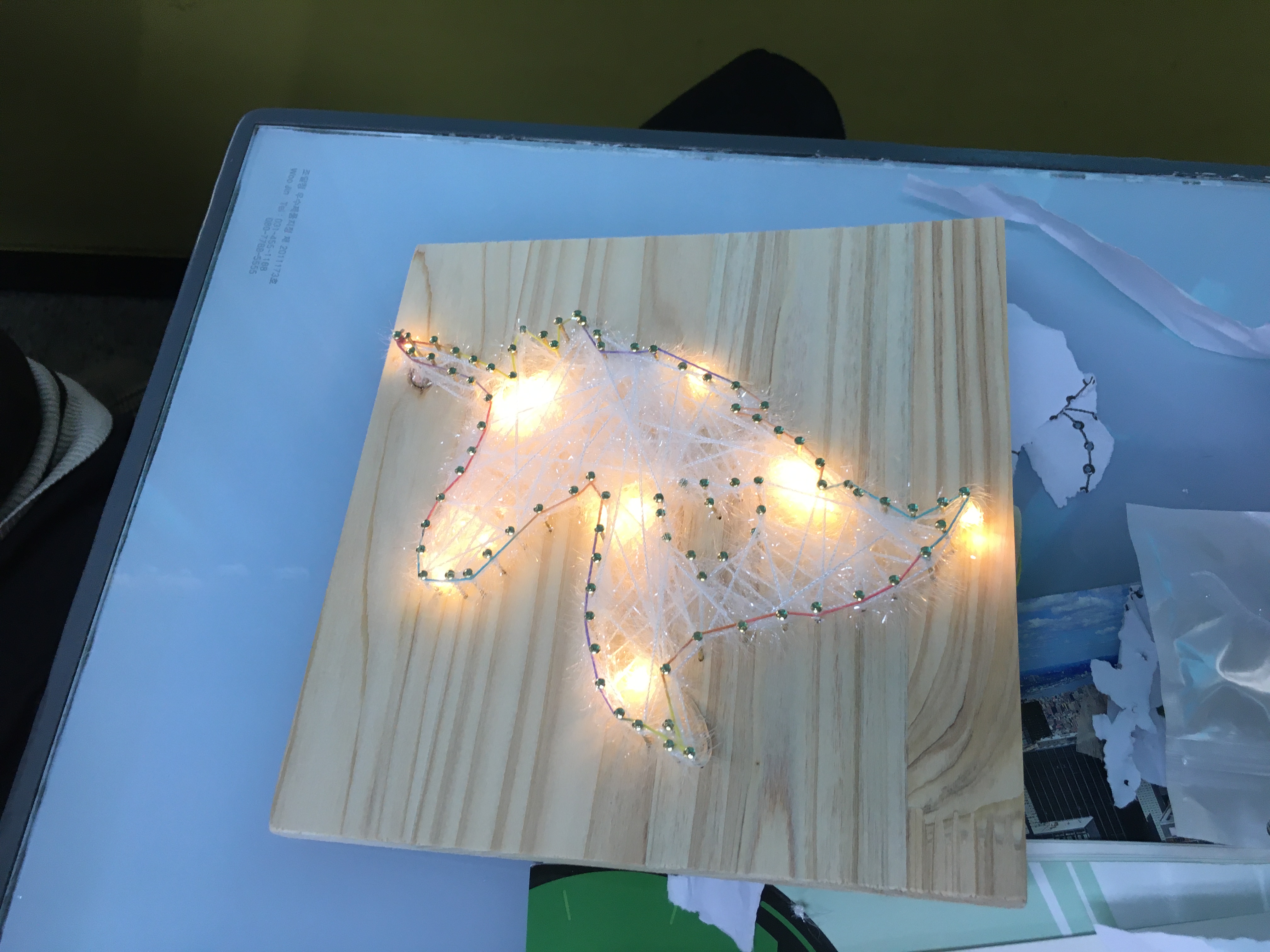 망치질을 다 했으면 종이를 제거한 후에 안쪽에 조명을 달아줍니다. 라인을 따라서 달아주는 친구들도 있고,