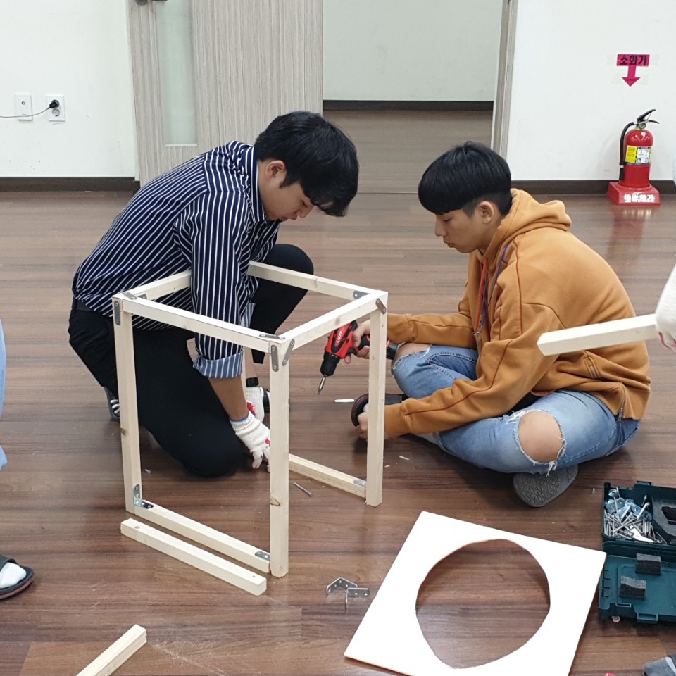 직접 크기에 맞춰 각목을 톱질하여 재단하고, 목공용 피스와 다양한 철물을 활용하여 전동드릴도 사용하면서