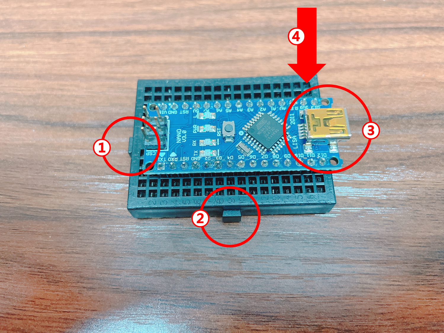 브레드보드의 가장 첫번째 칸(④)부터 나노를 조립합니다.